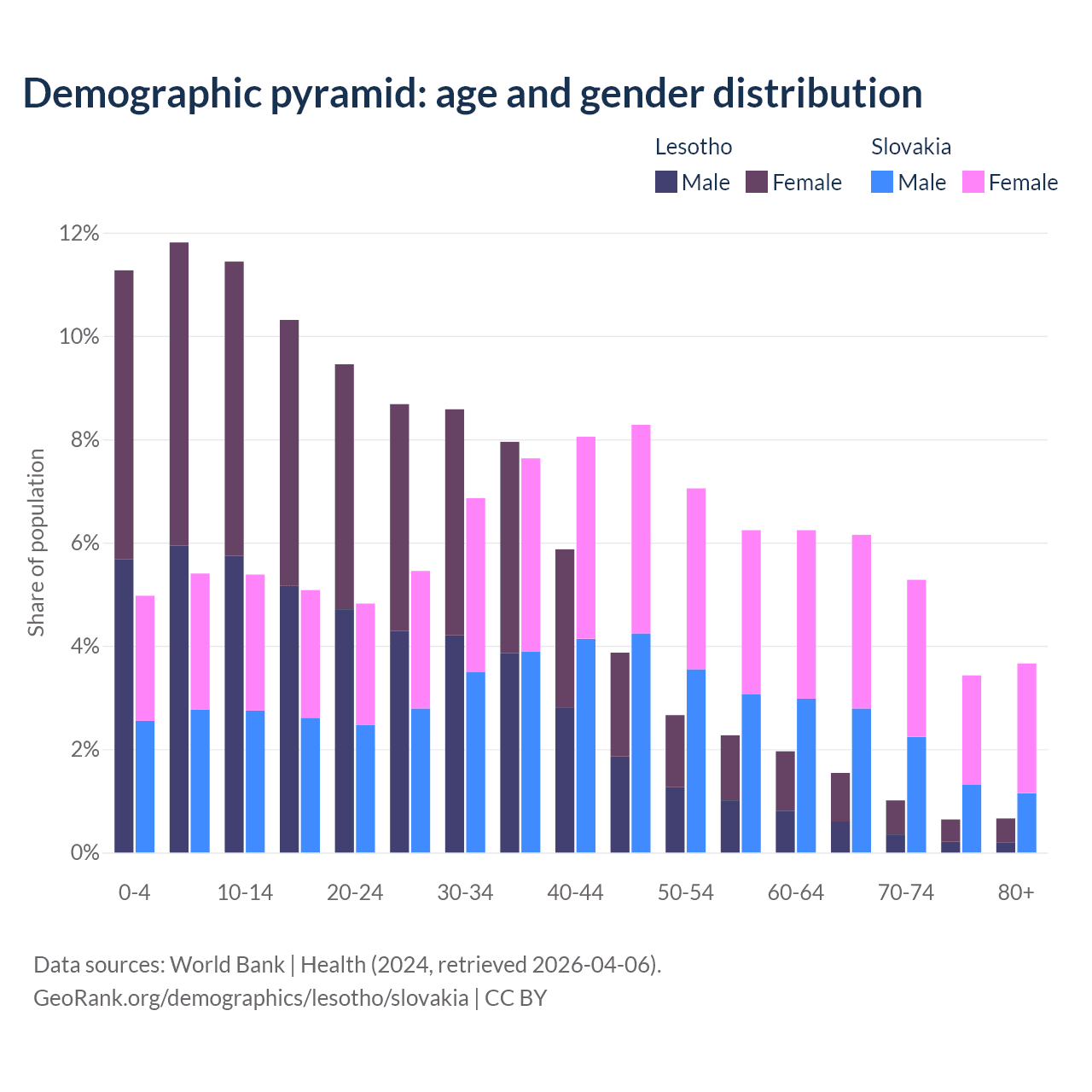 - As of 2026, the population of Lesotho is 2.4M vs 5.36M in Slovakia - 2.24 times difference.