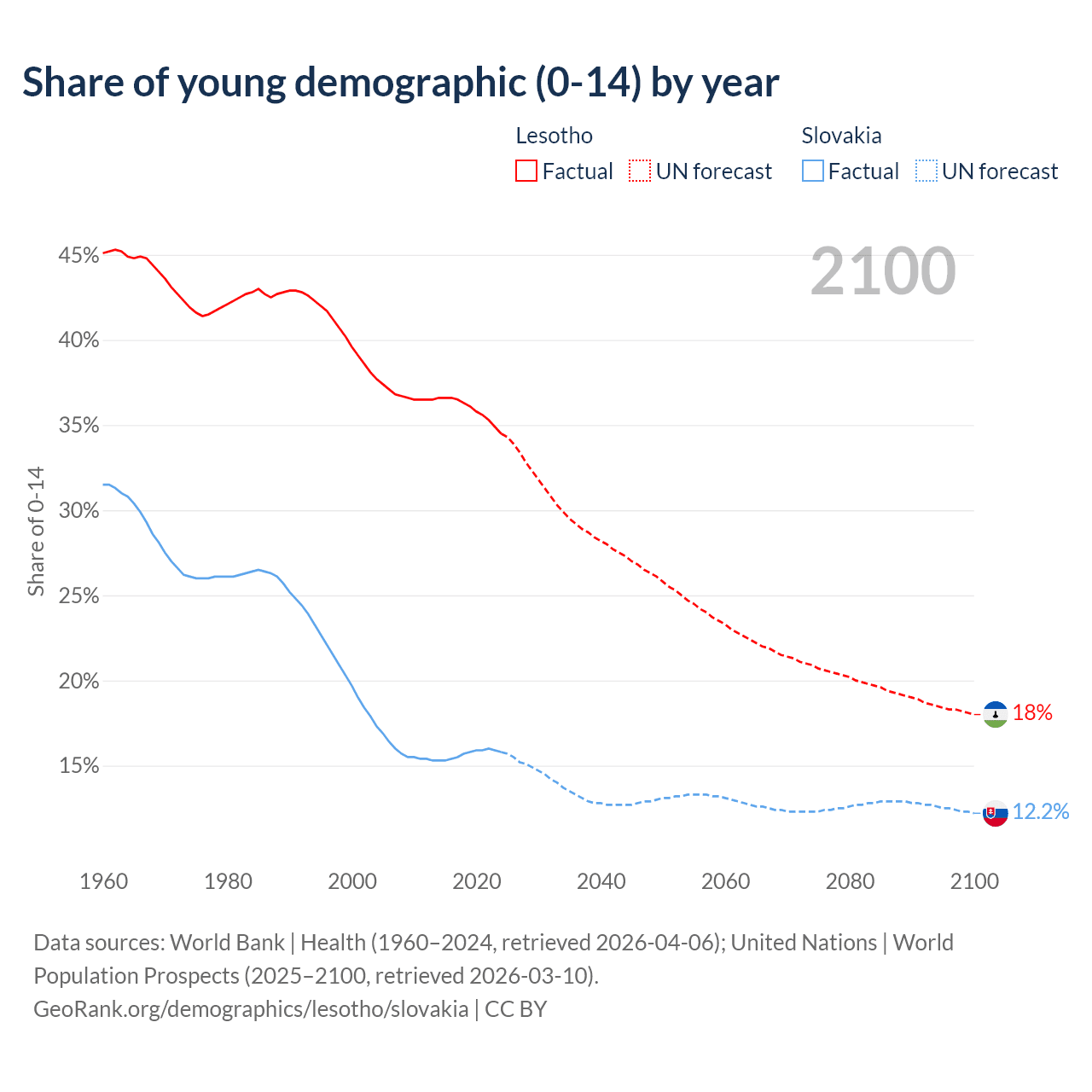 - The share of young demographic (0-15 years old) in Lesotho is 34.5% vs 15.8% in Slovakia.