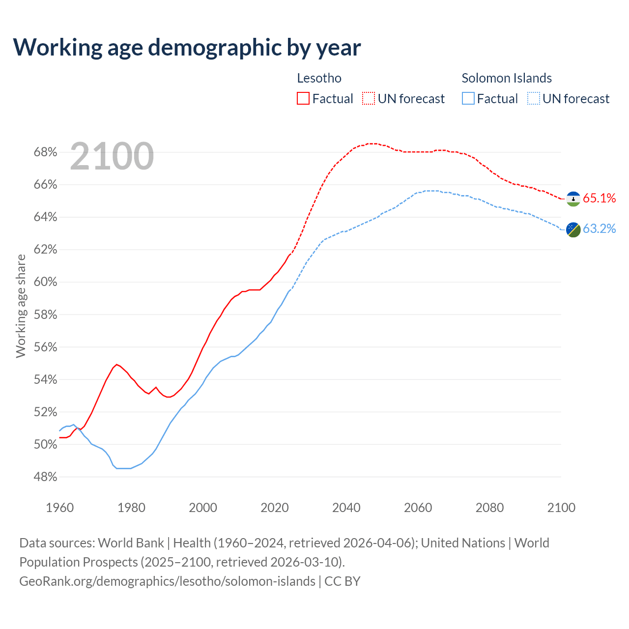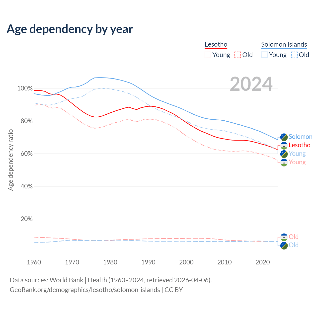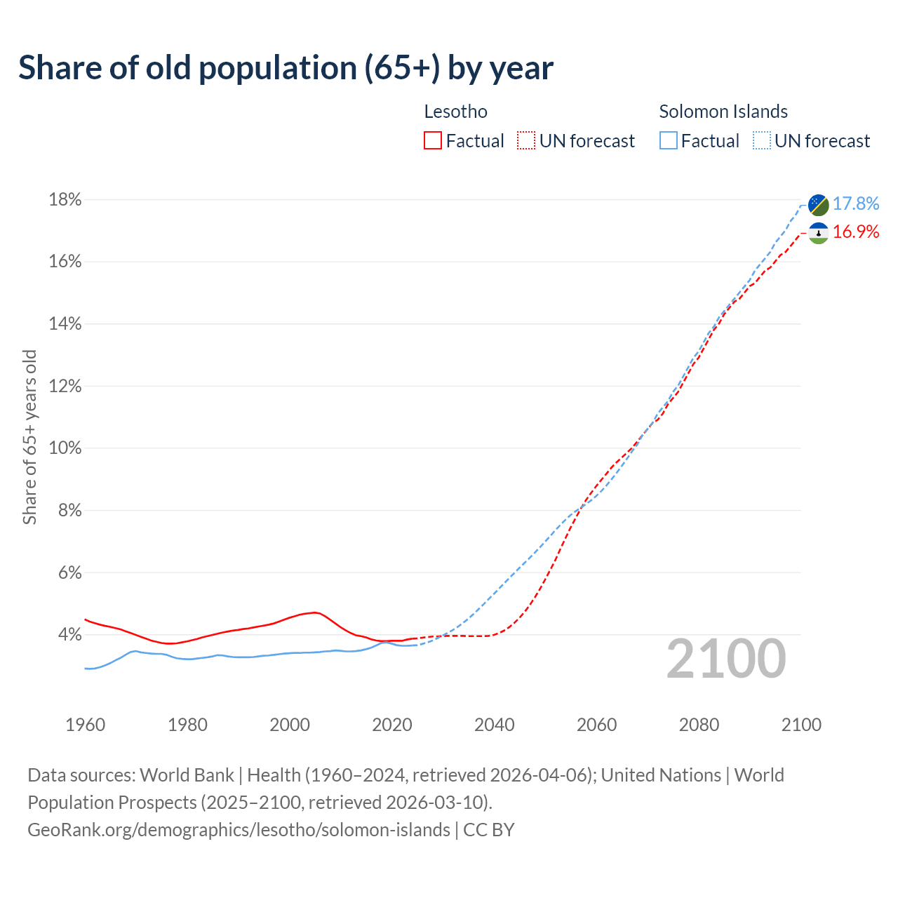 - The share of old-age demographic (65+) in Lesotho is 3.86% vs 3.64% in the Solomon Islands.