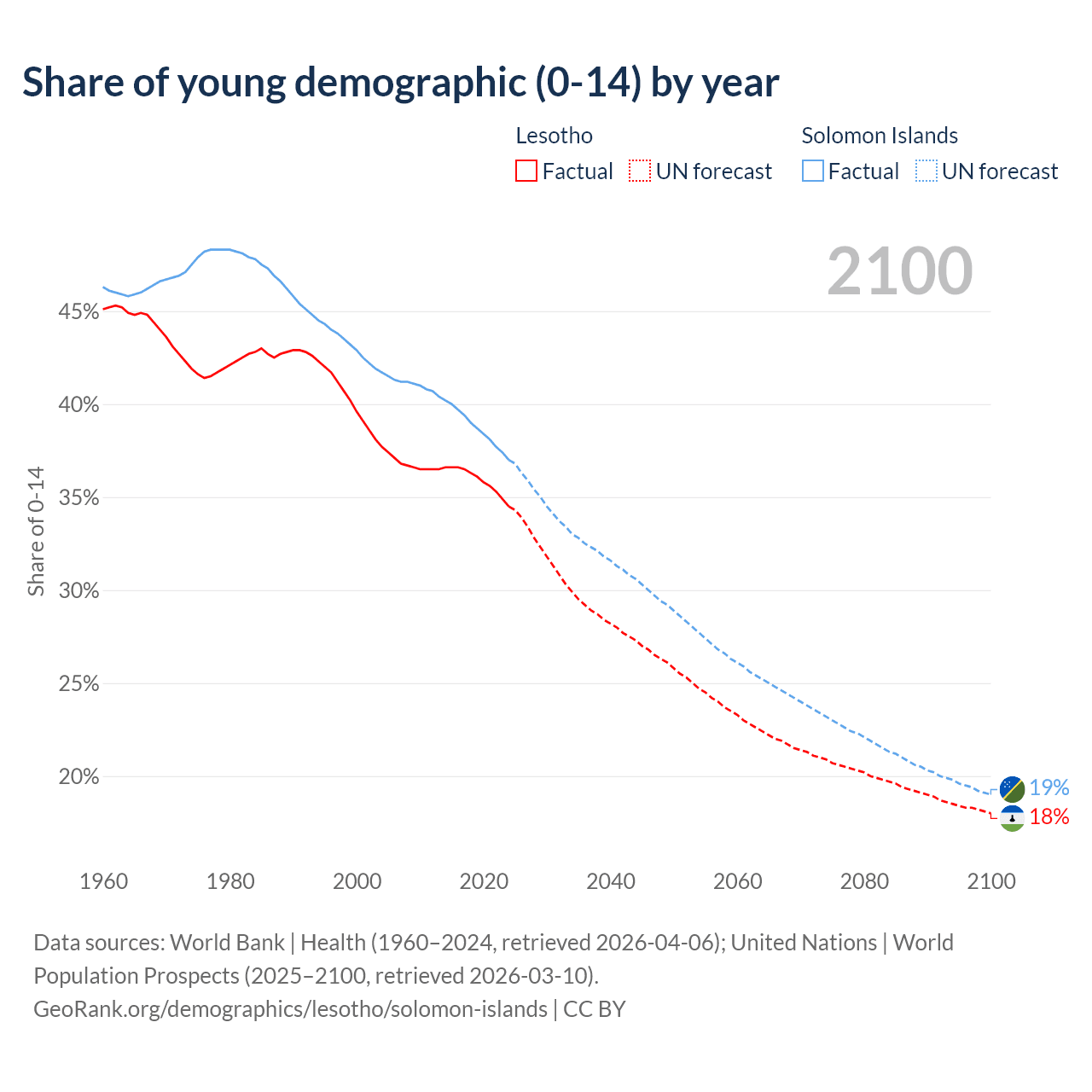 - The share of young demographic (0-15 years old) in Lesotho is 34.5% vs 37% in the Solomon Islands.