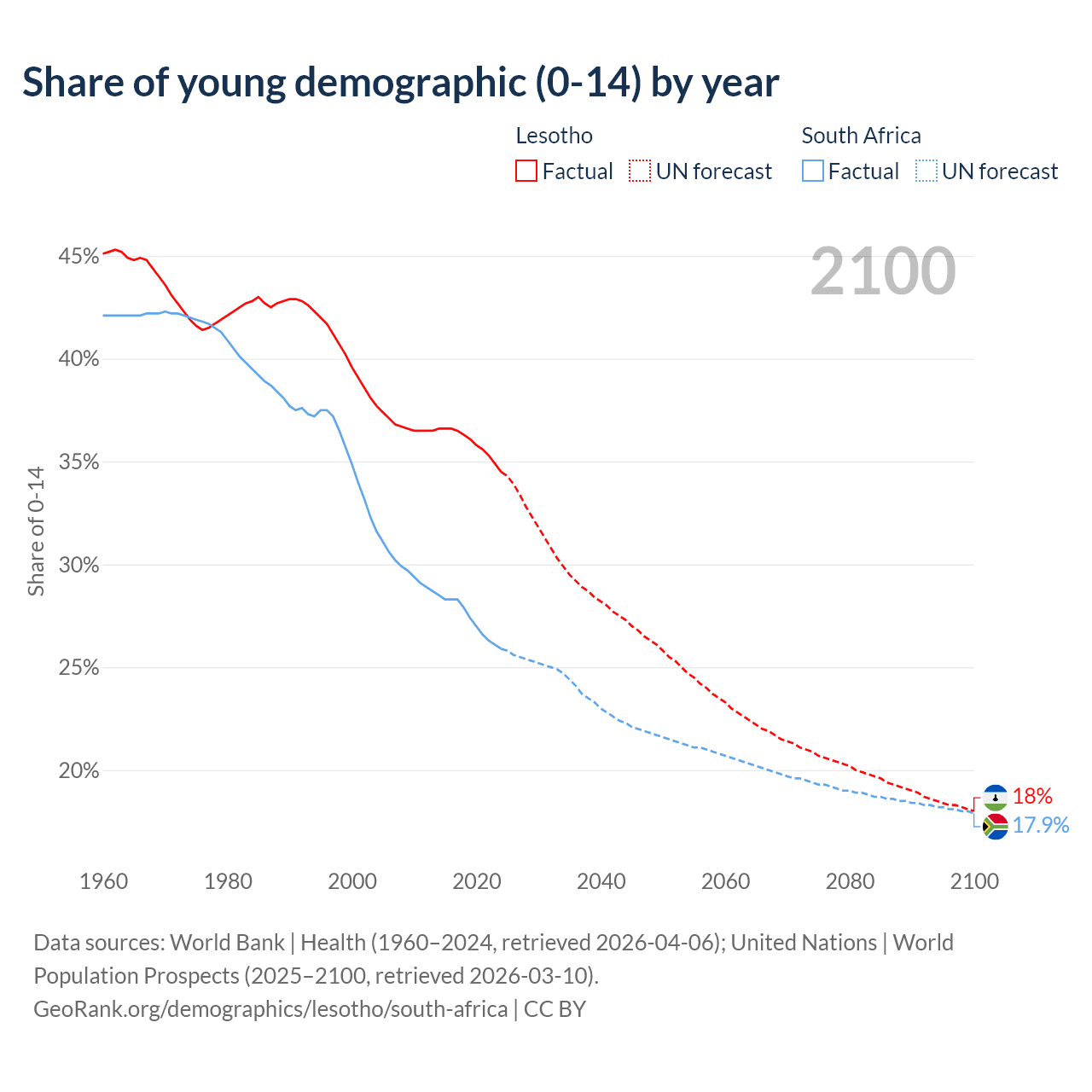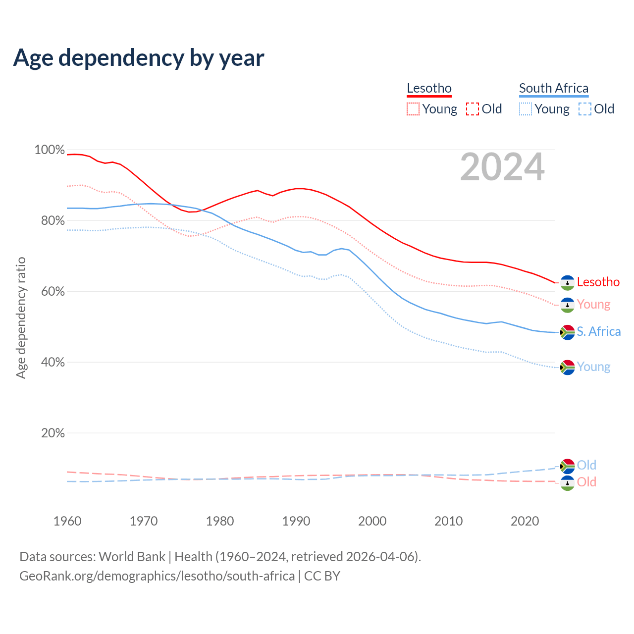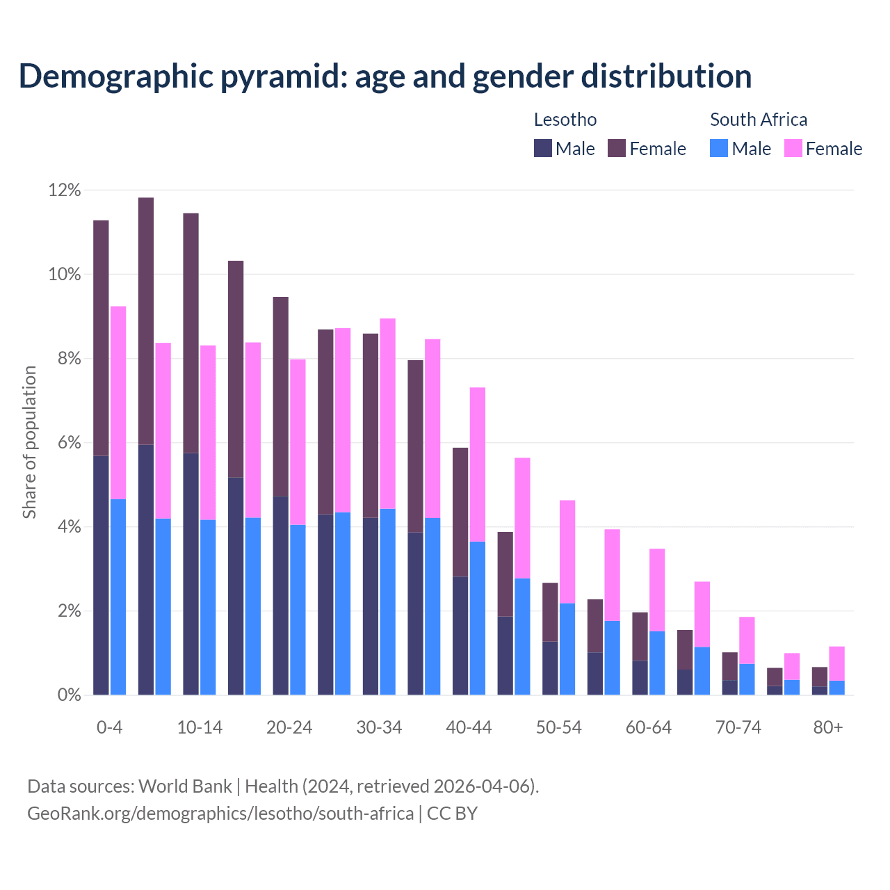 - Lesotho is ranked 143/196 by median age (oldest to youngest) vs 107/196 for South Africa.