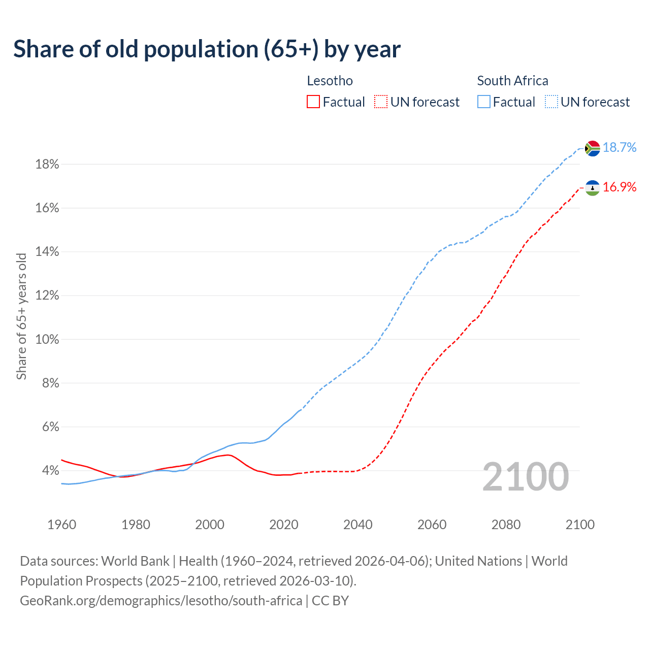 The share of older people aged 65 and over is 3.86% in Lesotho and 6.69% in South Africa. Life expectancy in Lesotho compared to South Africa .