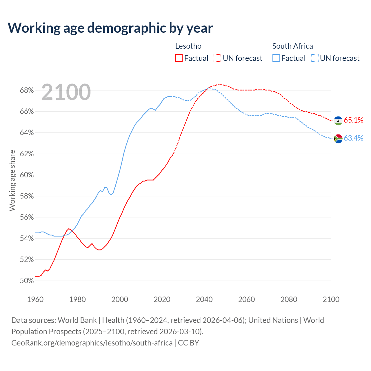 - Lesotho has 1.48M working age adults (aged 15-64) vs 44.3M in South Africa.