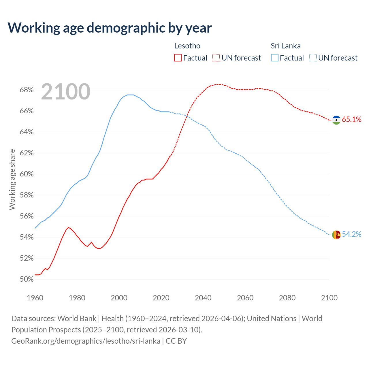 The share of older people aged 65 and over is 3.86% in Lesotho and 12.1% in Sri Lanka. Life expectancy in Lesotho compared to Sri Lanka .