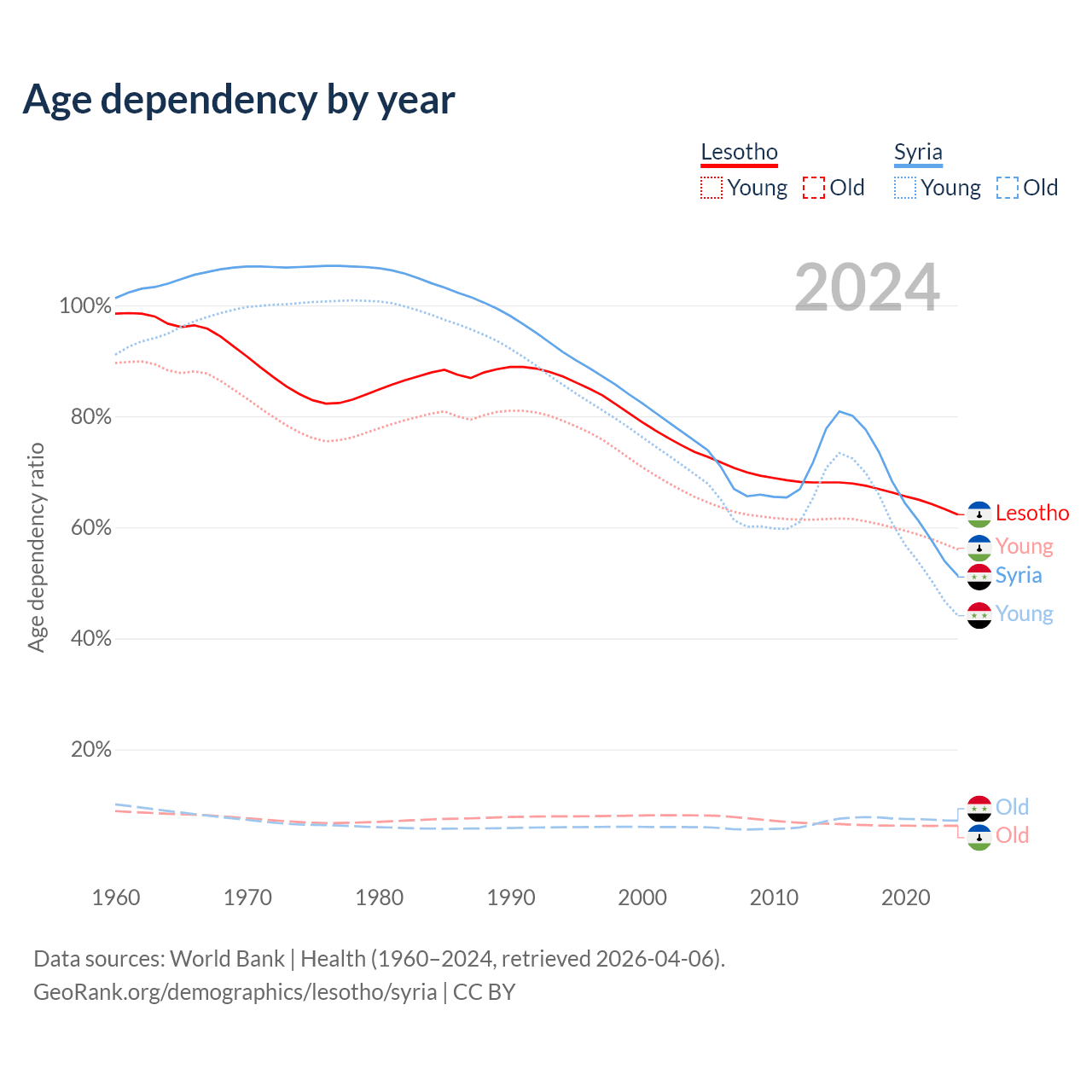 - The share of old-age demographic (65+) in Lesotho is 3.86% vs 4.74% in Syria.