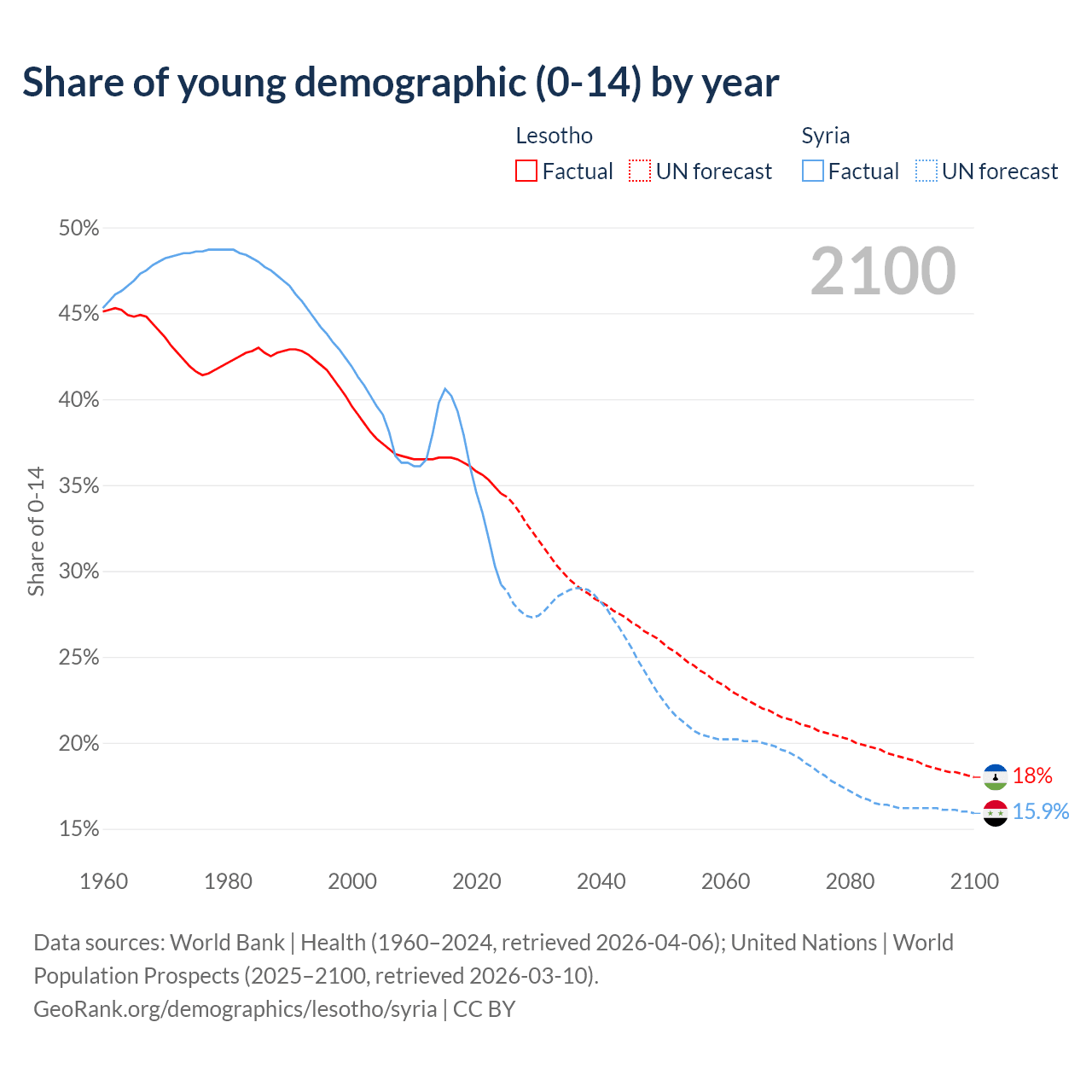 - The share of young demographic (0-15 years old) in Lesotho is 34.5% vs 29.2% in Syria.