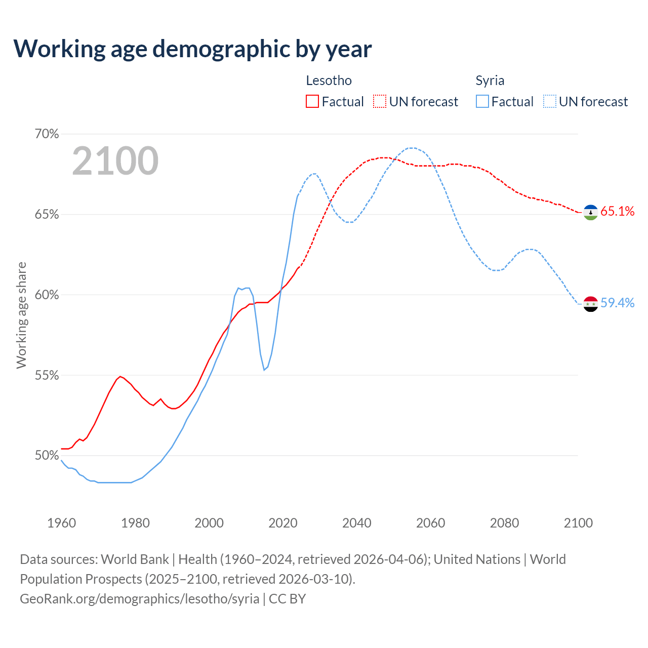 The share of older people aged 65 and over is 3.86% in Lesotho and 4.74% in Syria. Life expectancy in Lesotho compared to Syria .
