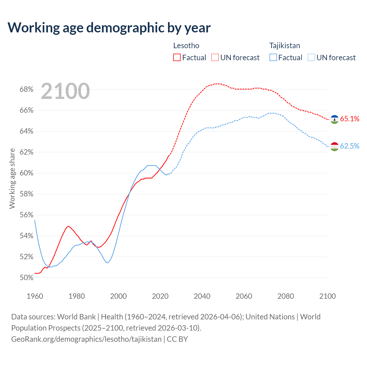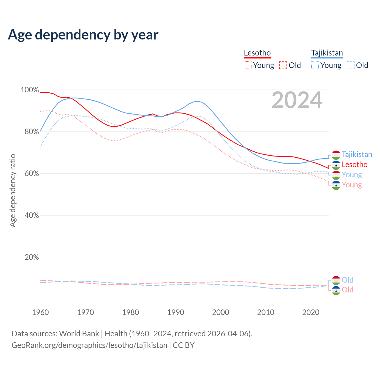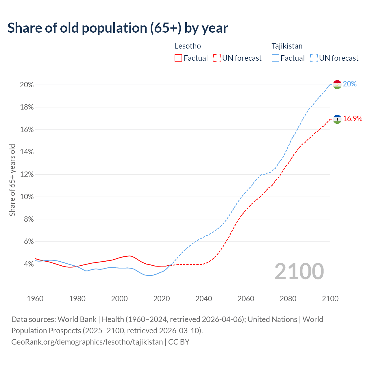 - The share of old-age demographic (65+) in Lesotho is 3.86% vs 3.85% in Tajikistan.