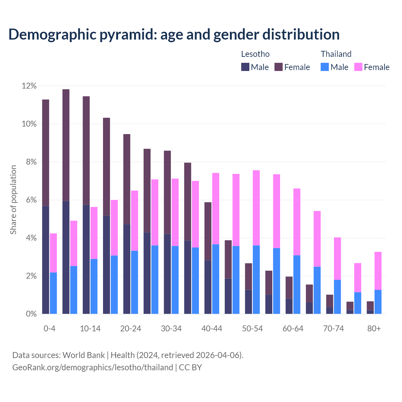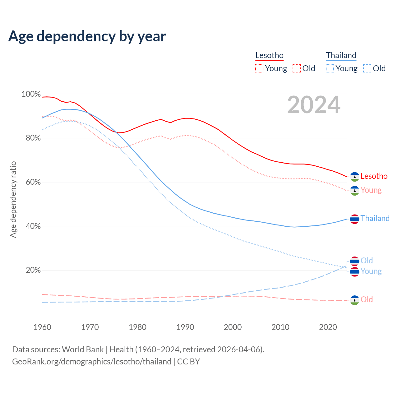 - Lesotho is ranked 143/196 by median age (oldest to youngest) vs 40/196 for Thailand.