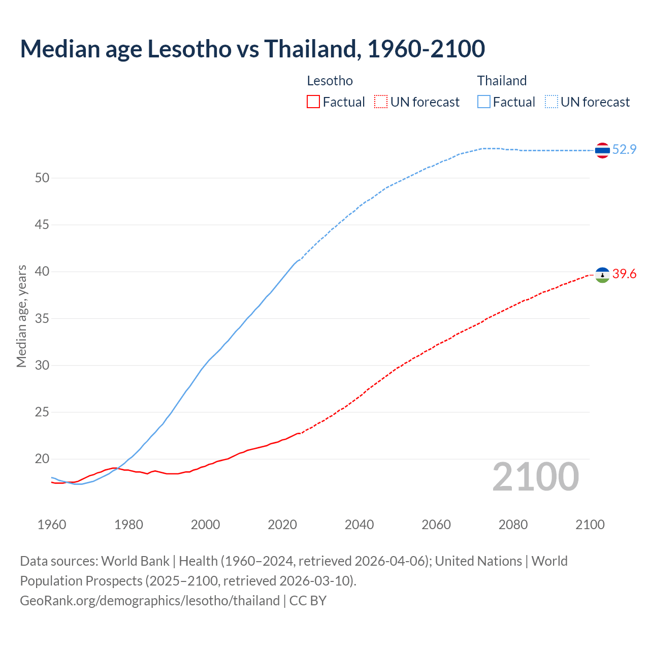 - The median age in Lesotho is 22.7 years compared to 41.1 years in Thailand.