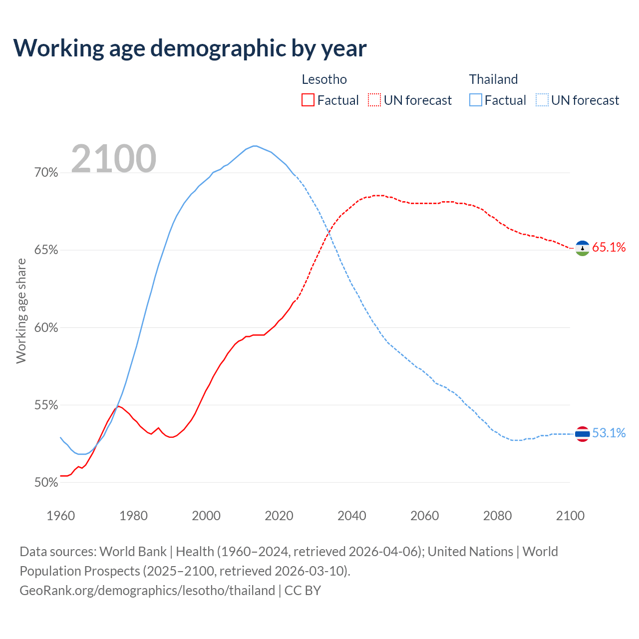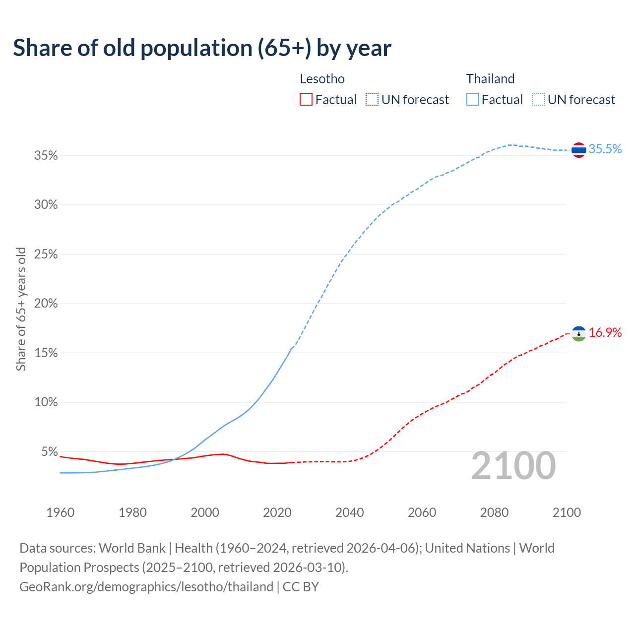 The share of older people aged 65 and over is 3.86% in Lesotho and 15.4% in Thailand. Life expectancy in Lesotho compared to Thailand .