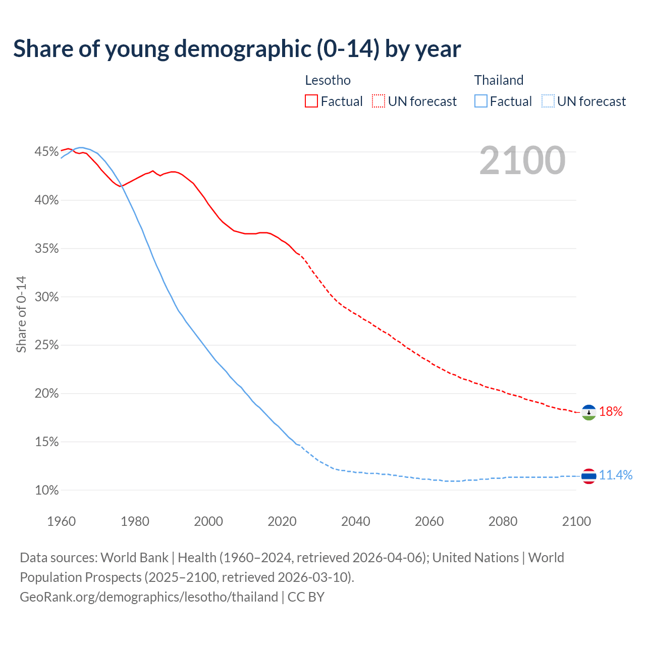 - The share of young demographic (0-15 years old) in Lesotho is 34.5% vs 14.7% in Thailand.