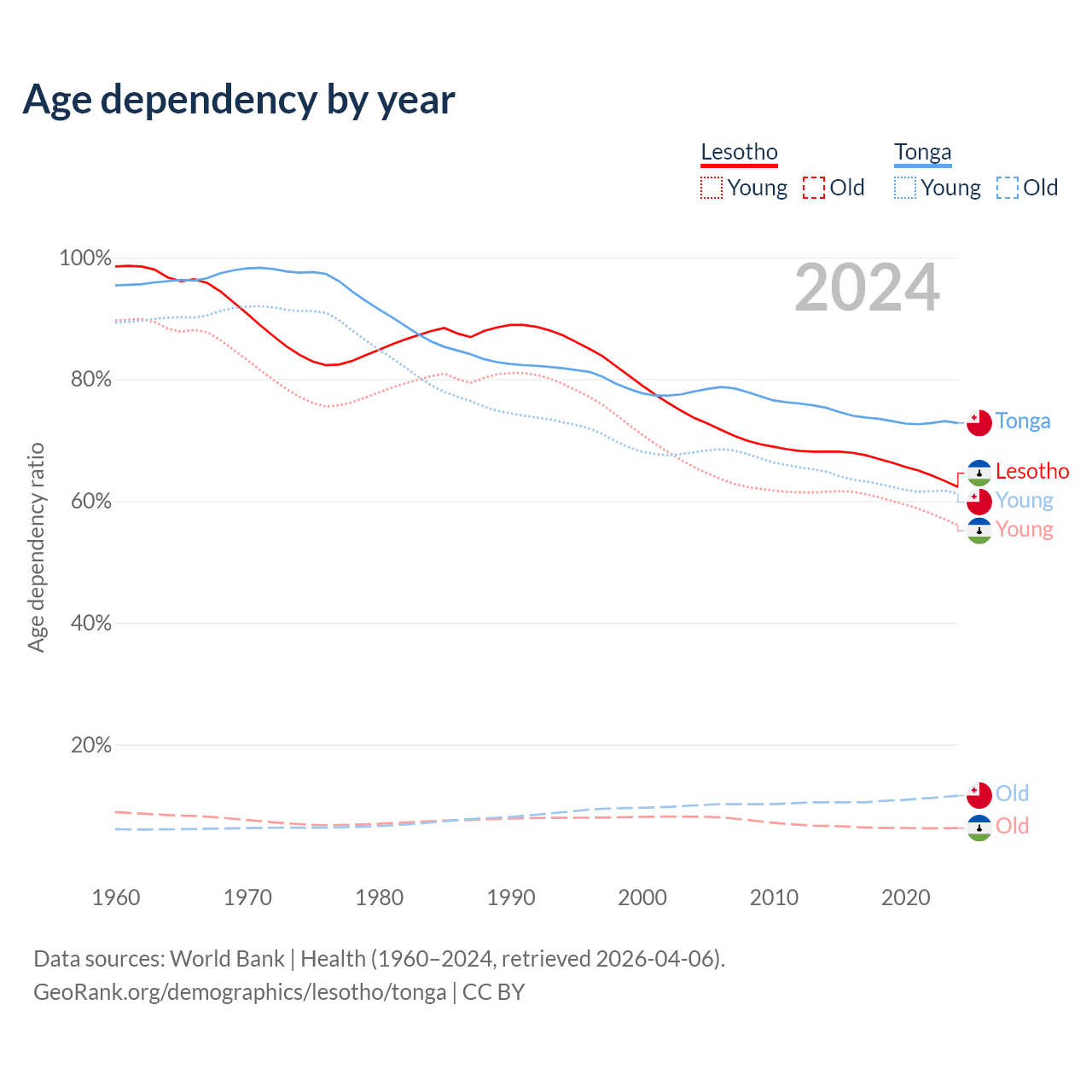 - The share of old-age demographic (65+) in Lesotho is 3.86% vs 6.72% in Tonga.