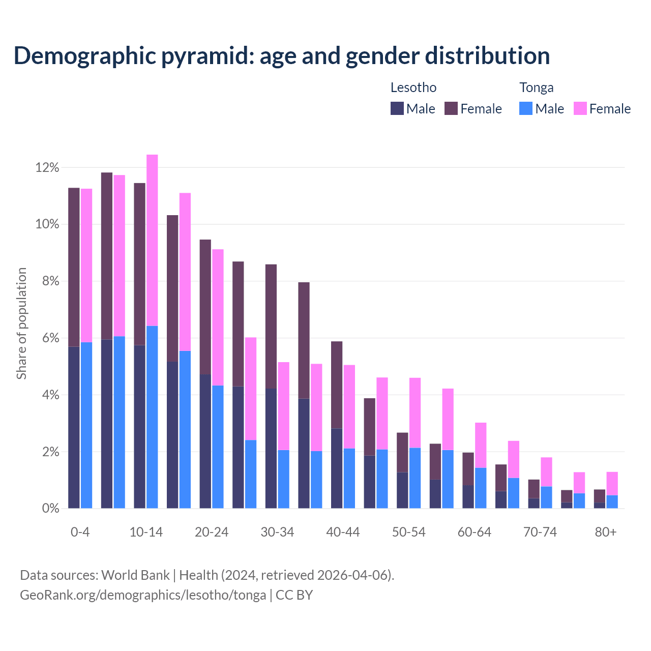 - As of 2026, the population of Lesotho is 2.4M vs 103K in Tonga - 23.2 times difference.