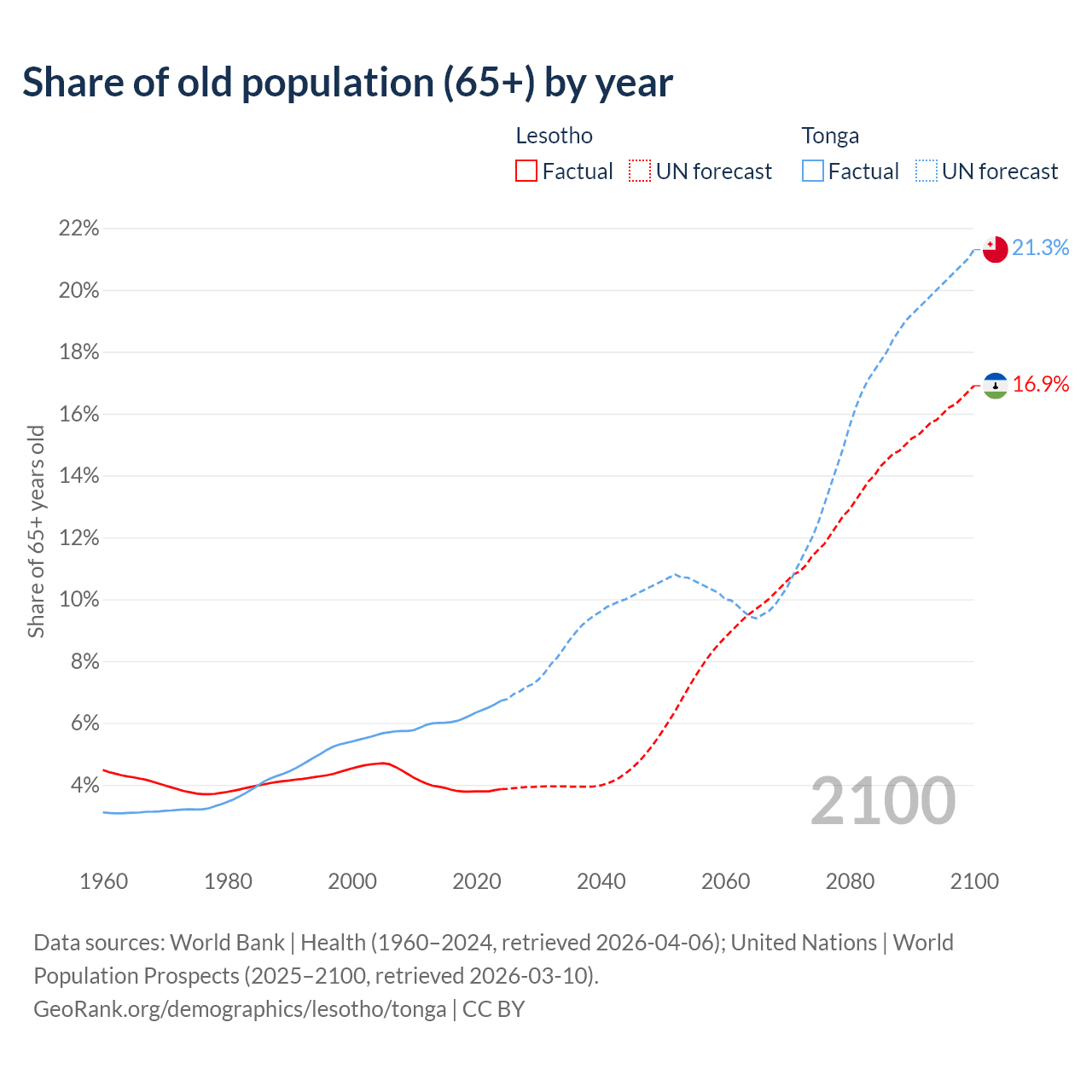 The share of older people aged 65 and over is 3.86% in Lesotho and 6.72% in Tonga. Life expectancy in Lesotho compared to Tonga .