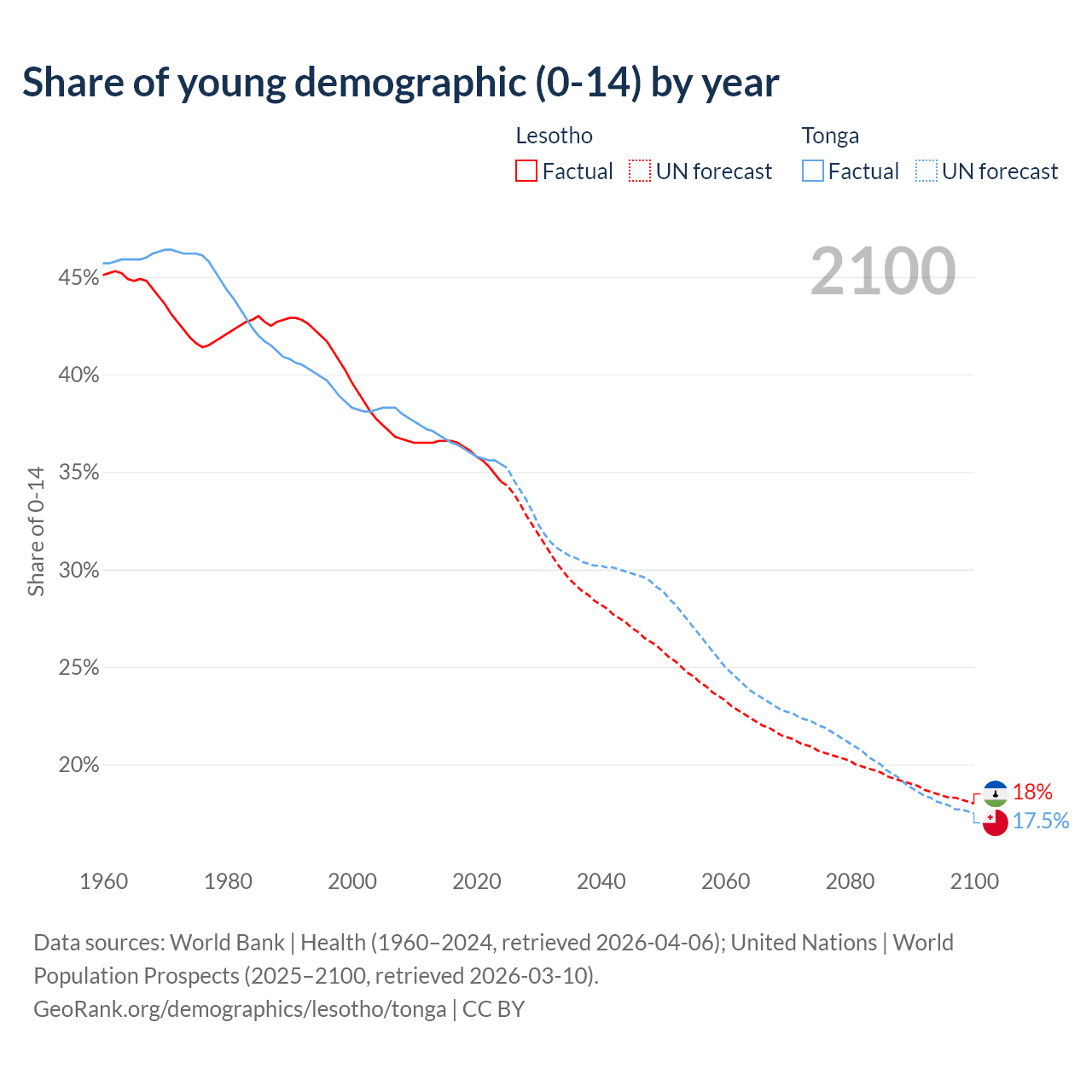 - The share of young demographic (0-15 years old) in Lesotho is 34.5% vs 35.4% in Tonga.
