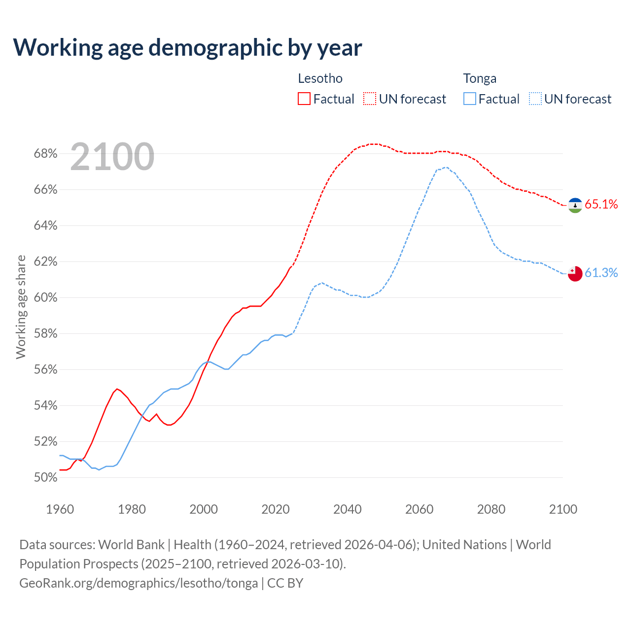 - Lesotho has 1.48M working age adults (aged 15-64) vs 59.8K in Tonga.
