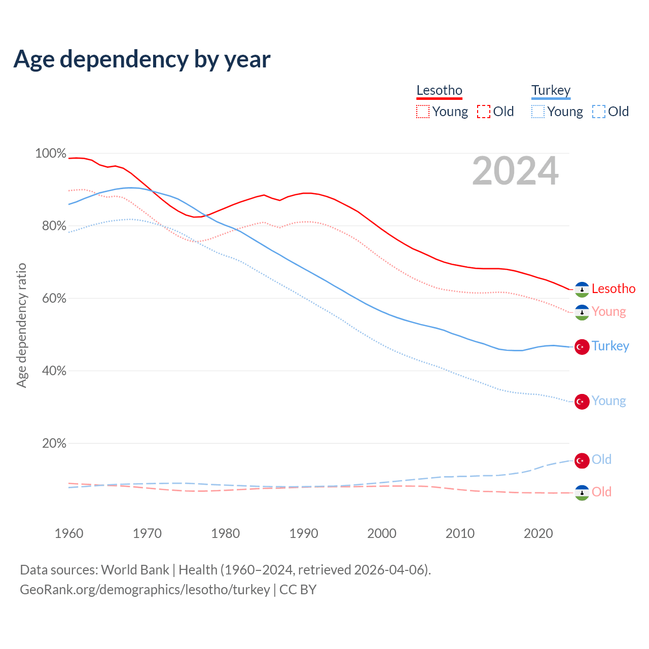 - Lesotho is ranked 143/196 by median age (oldest to youngest) vs 83/196 for Turkey.