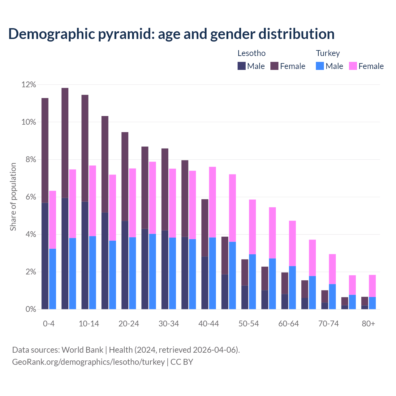 The share of older people aged 65 and over is 3.86% in Lesotho and 10.3% in Turkey. Life expectancy in Lesotho compared to Turkey .