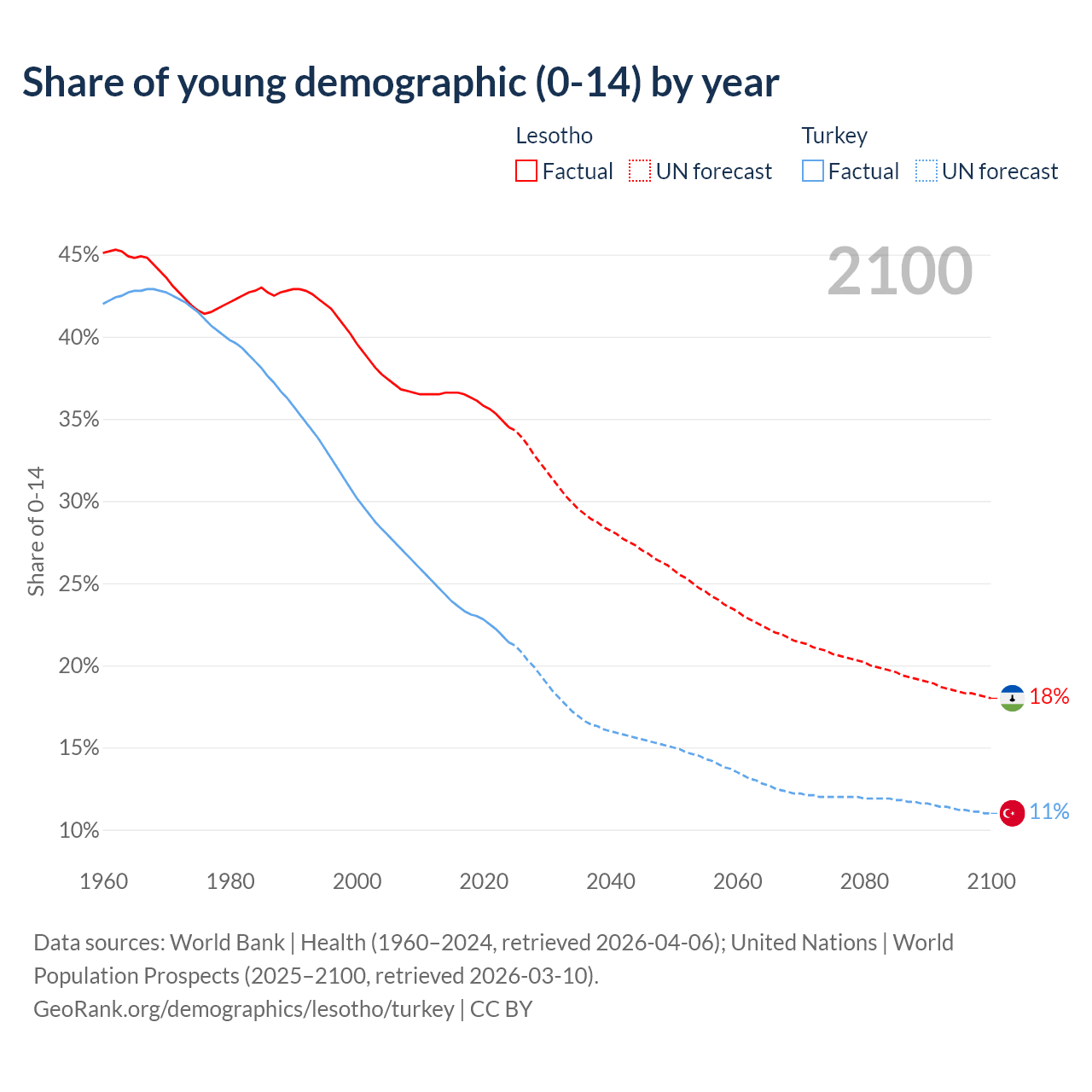 - The share of young demographic (0-15 years old) in Lesotho is 34.5% vs 21.4% in Turkey.