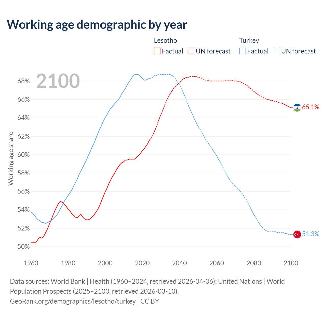 - Lesotho has 1.48M working age adults (aged 15-64) vs 58.7M in Turkey.