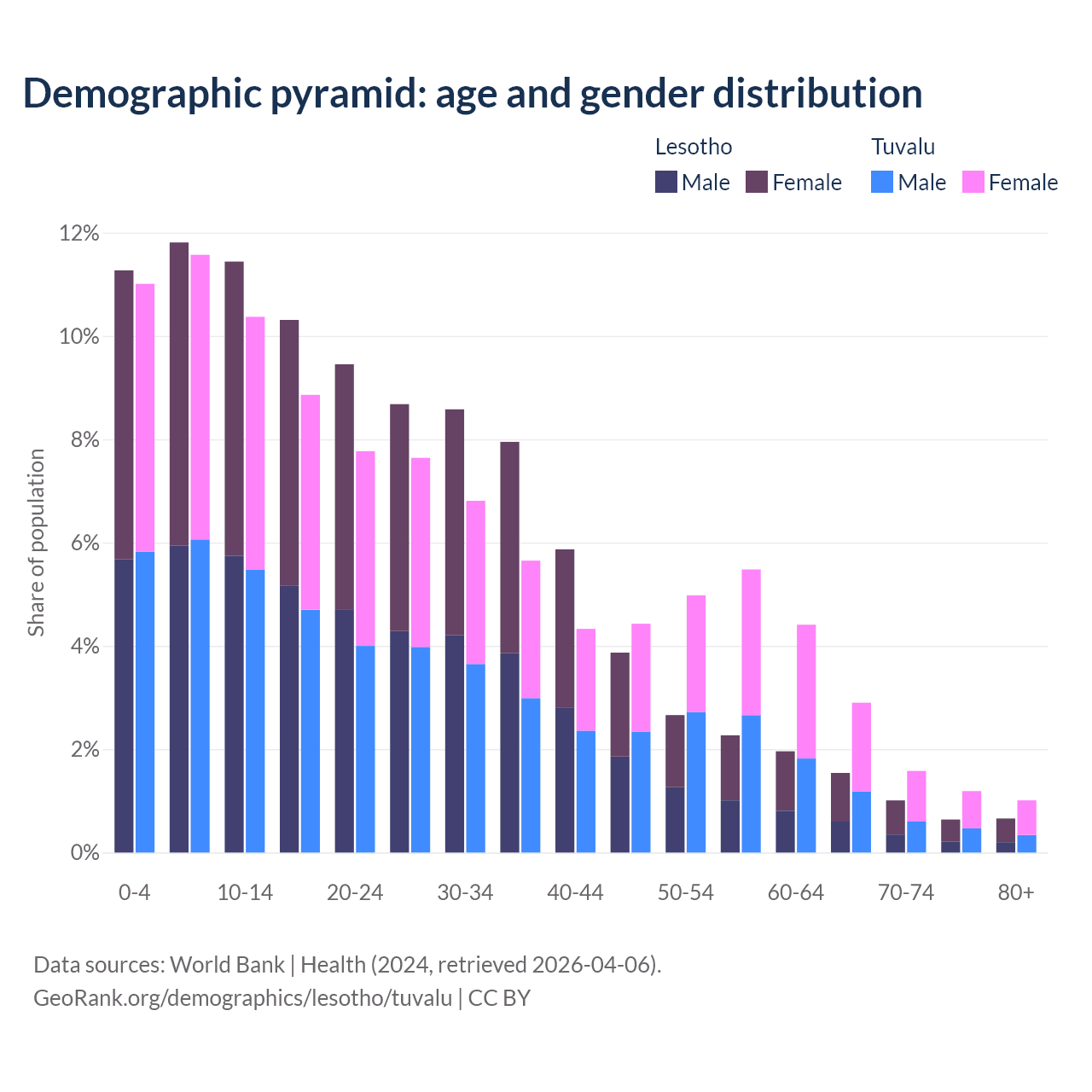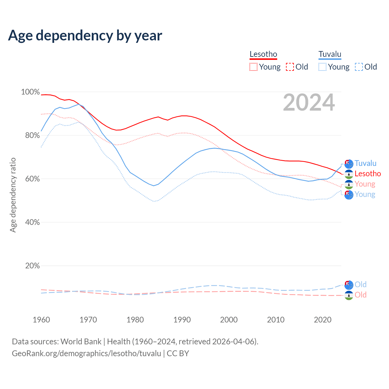 - The share of old-age demographic (65+) in Lesotho is 3.86% vs 6.67% in Tuvalu.