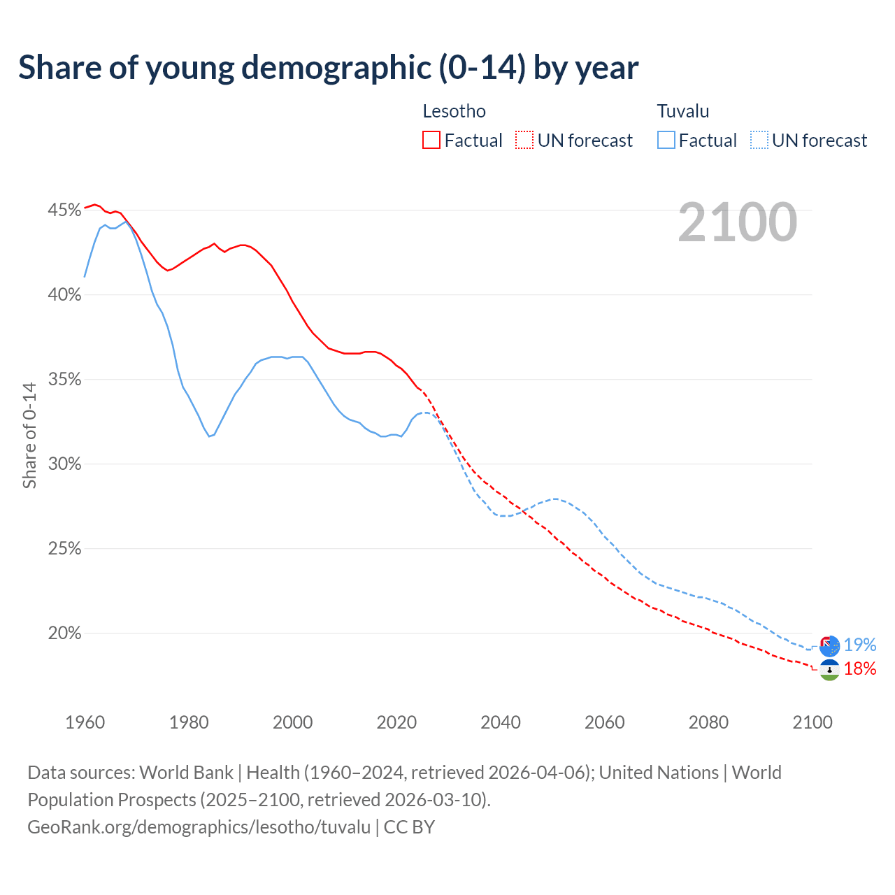 - The share of young demographic (0-15 years old) in Lesotho is 34.5% vs 32.9% in Tuvalu.