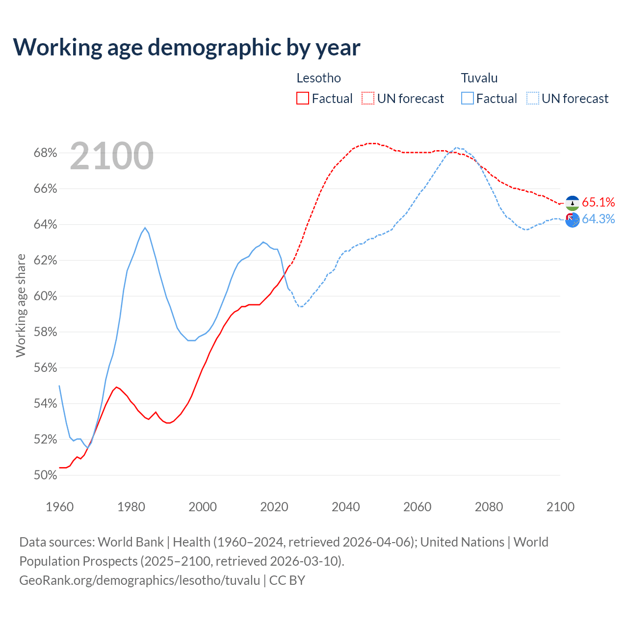 - Lesotho has 1.48M working age adults (aged 15-64) vs 5.64K in Tuvalu.