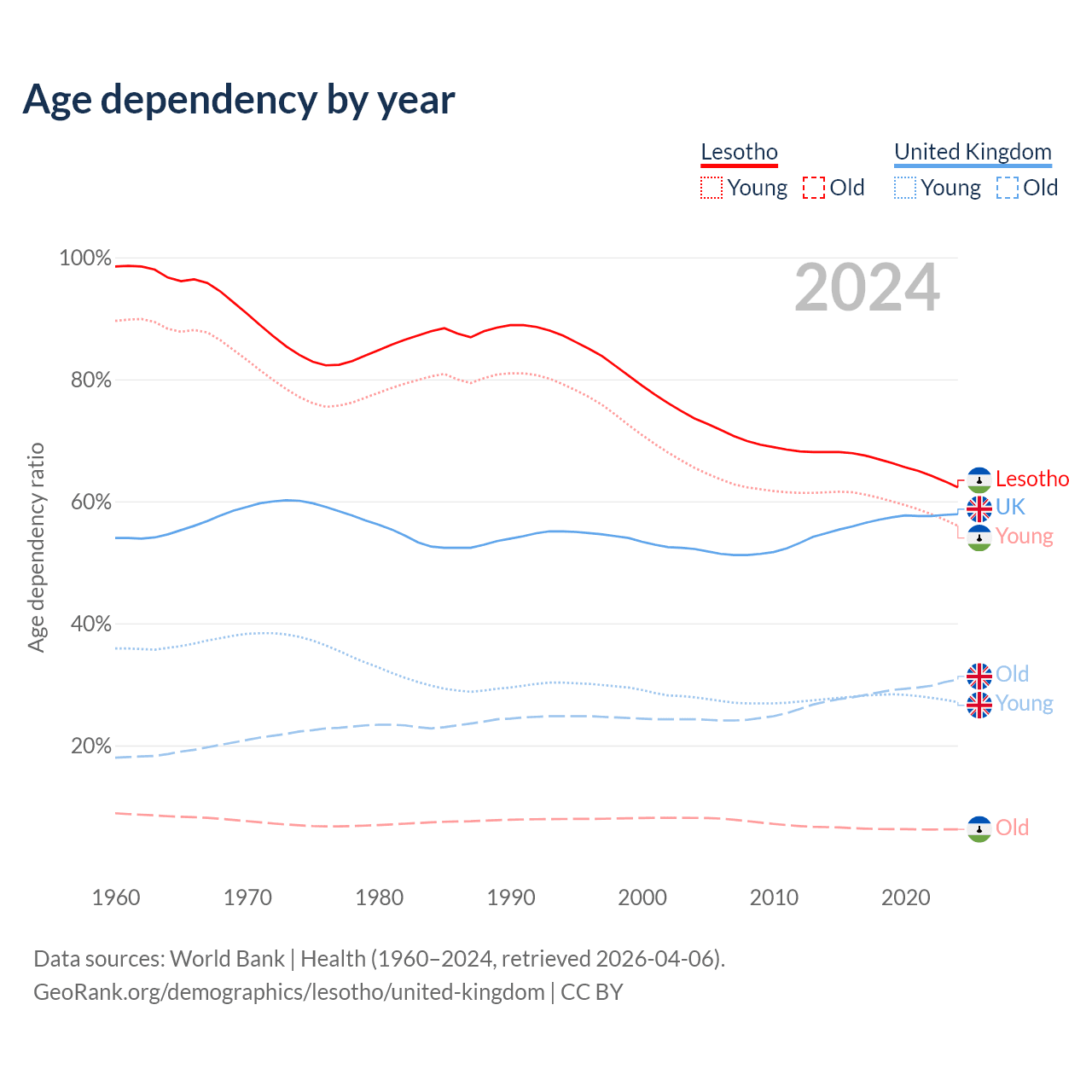 - The share of young demographic (0-15 years old) in Lesotho is 34.5% vs 17.2% in the United Kingdom.