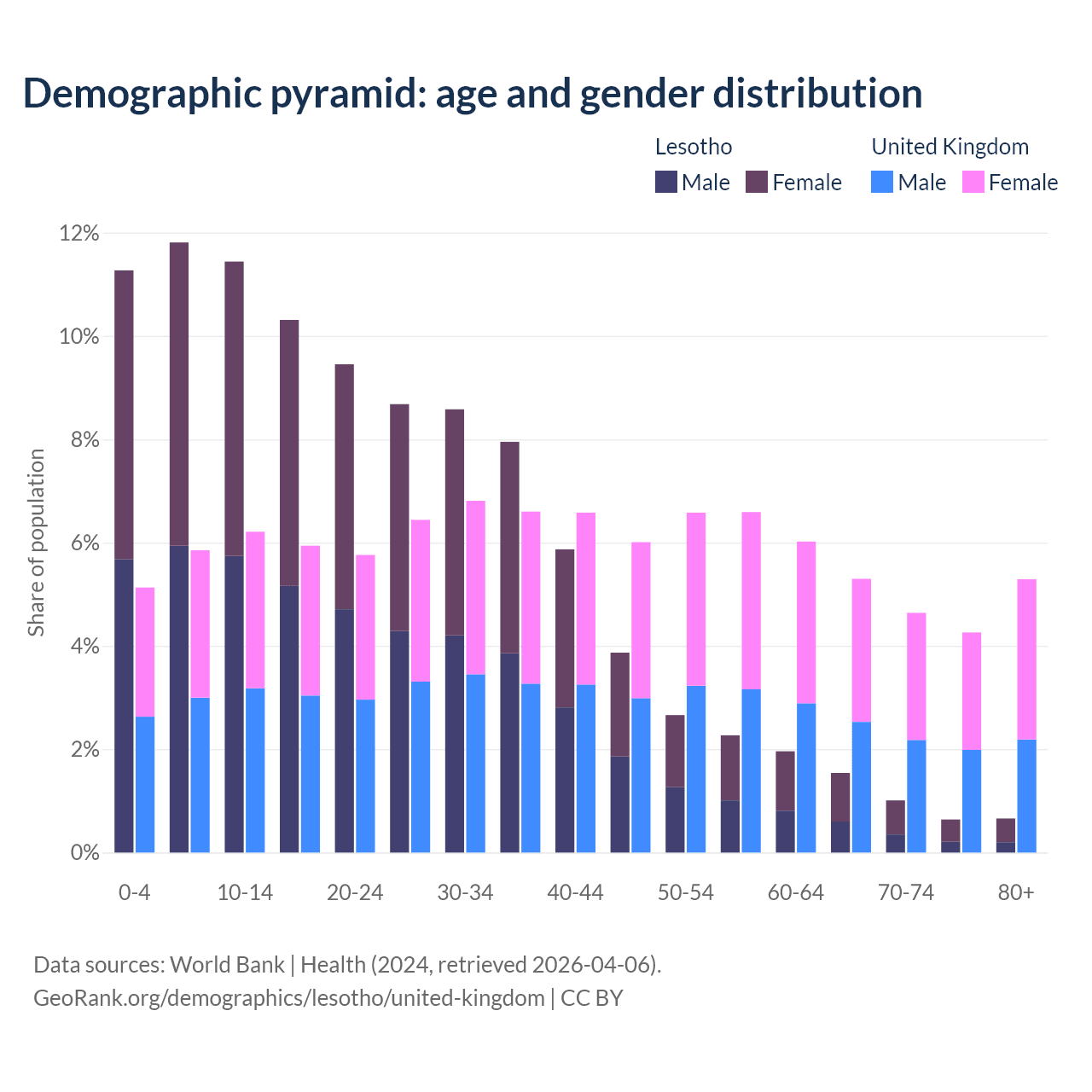 - The share of old-age demographic (65+) in Lesotho is 3.86% vs 19.5% in the United Kingdom.