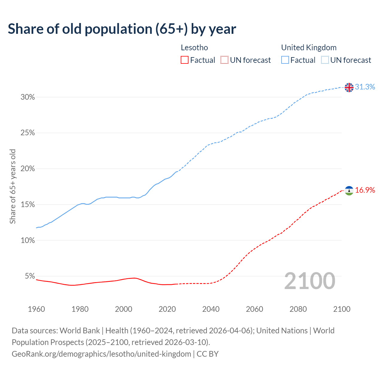 The share of older people aged 65 and over is 3.86% in Lesotho and 19.5% in the United Kingdom. Life expectancy in Lesotho compared to the United Kingdom .