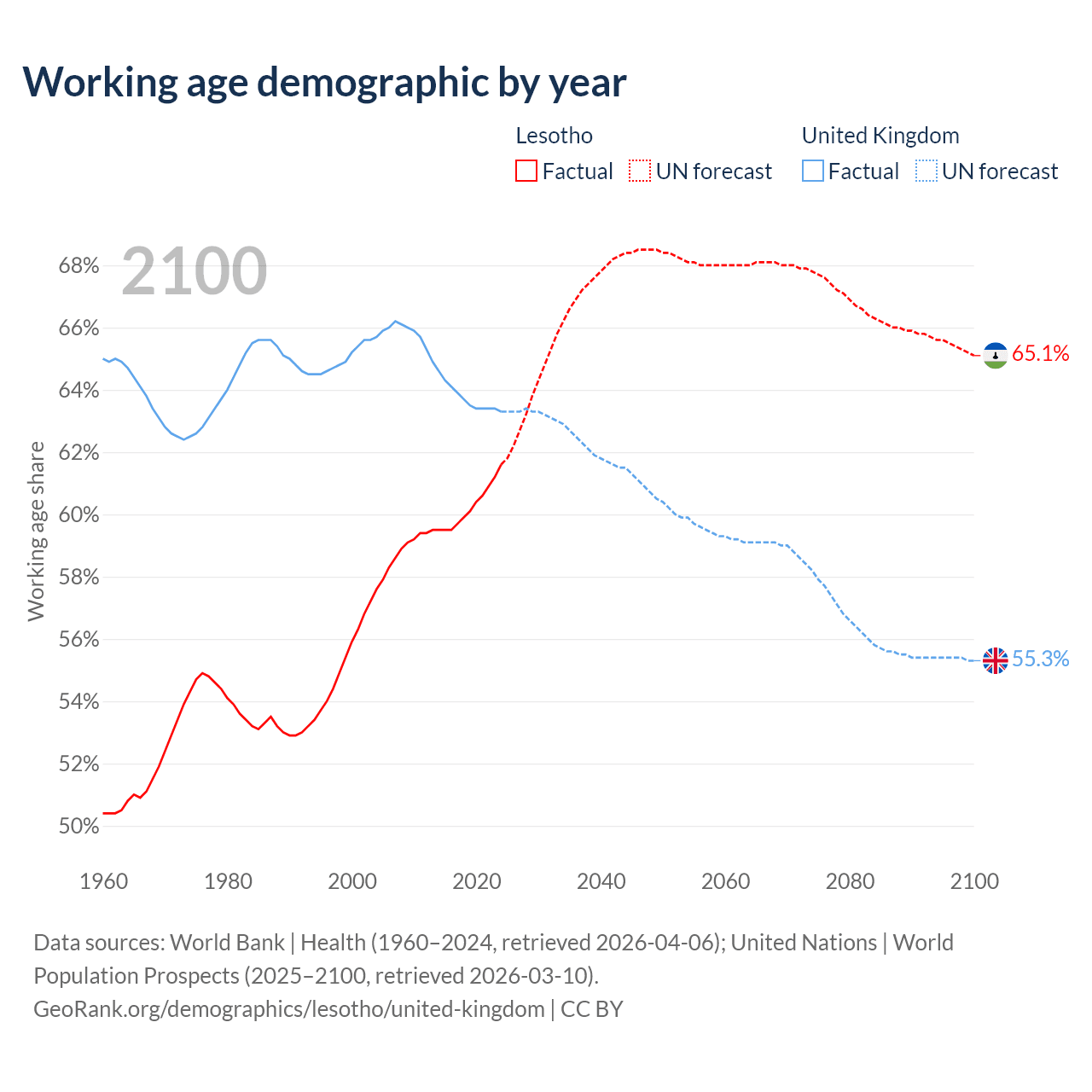 - Lesotho has 1.48M working age adults (aged 15-64) vs 44.4M in the United Kingdom.