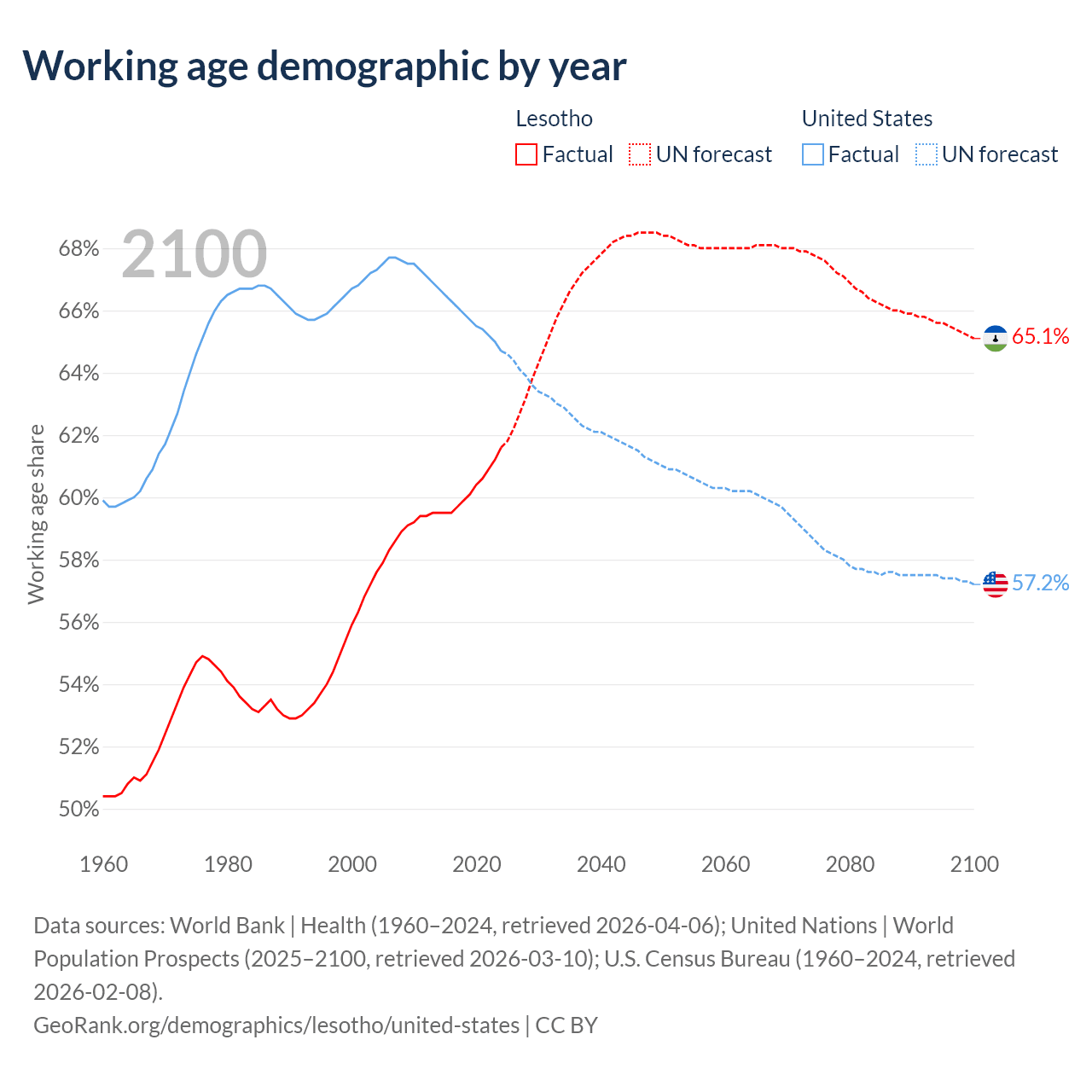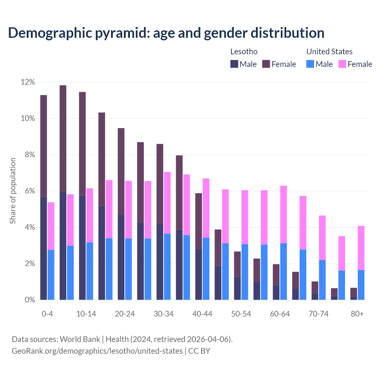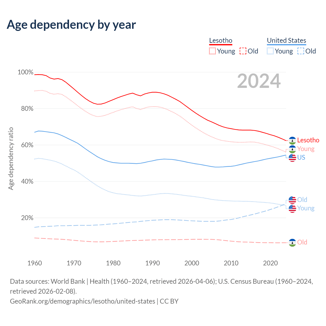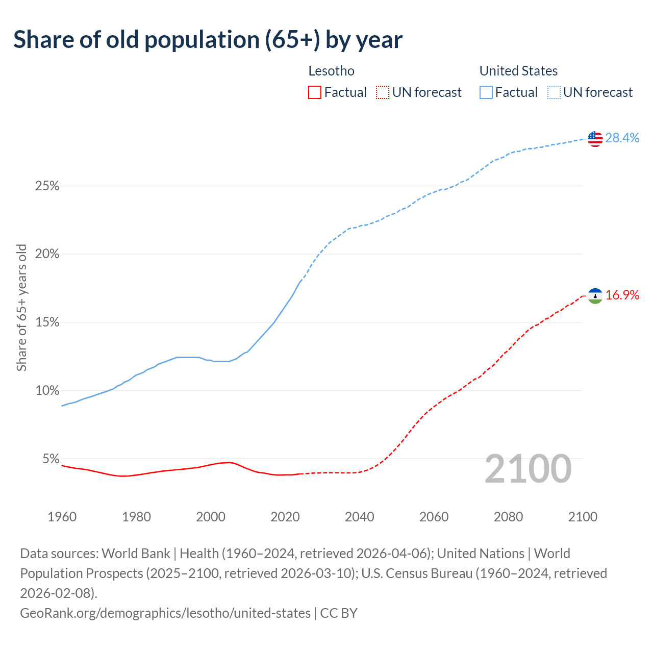 - The share of old-age demographic (65+) in Lesotho is 3.86% vs 17.9% in the United States.
