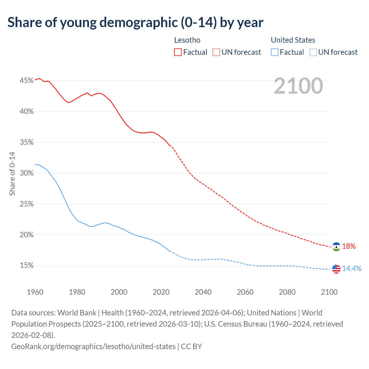 - The share of young demographic (0-15 years old) in Lesotho is 34.5% vs 17.3% in the United States.