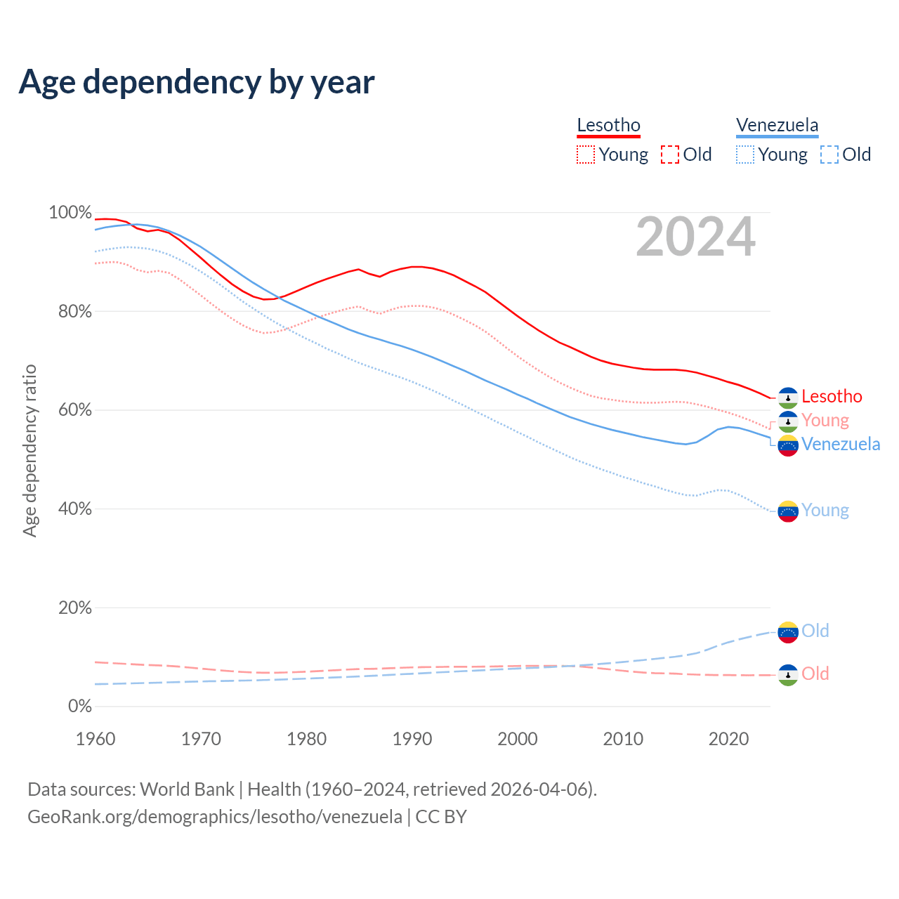 - Lesotho is ranked 143/196 by median age (oldest to youngest) vs 104/196 for Venezuela.