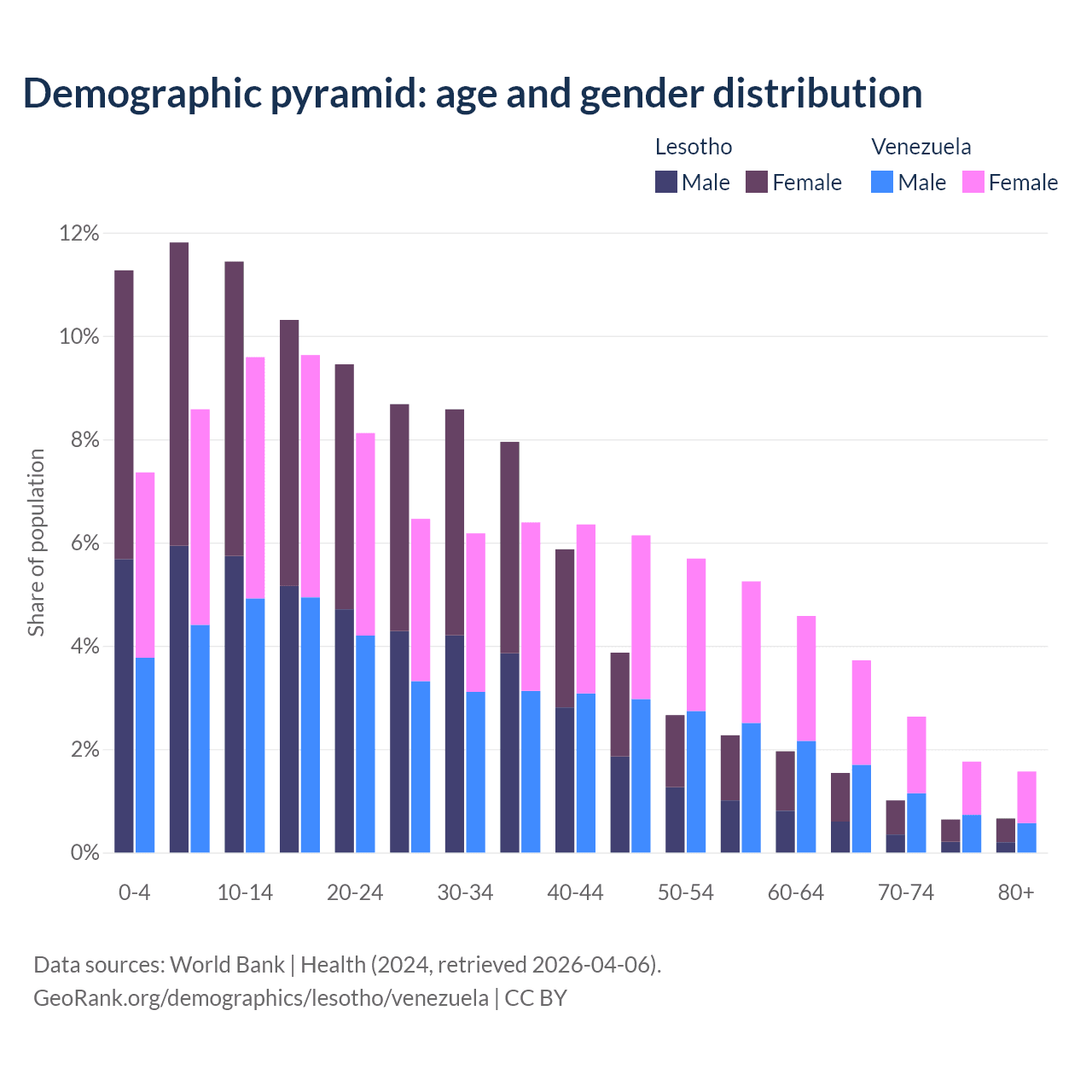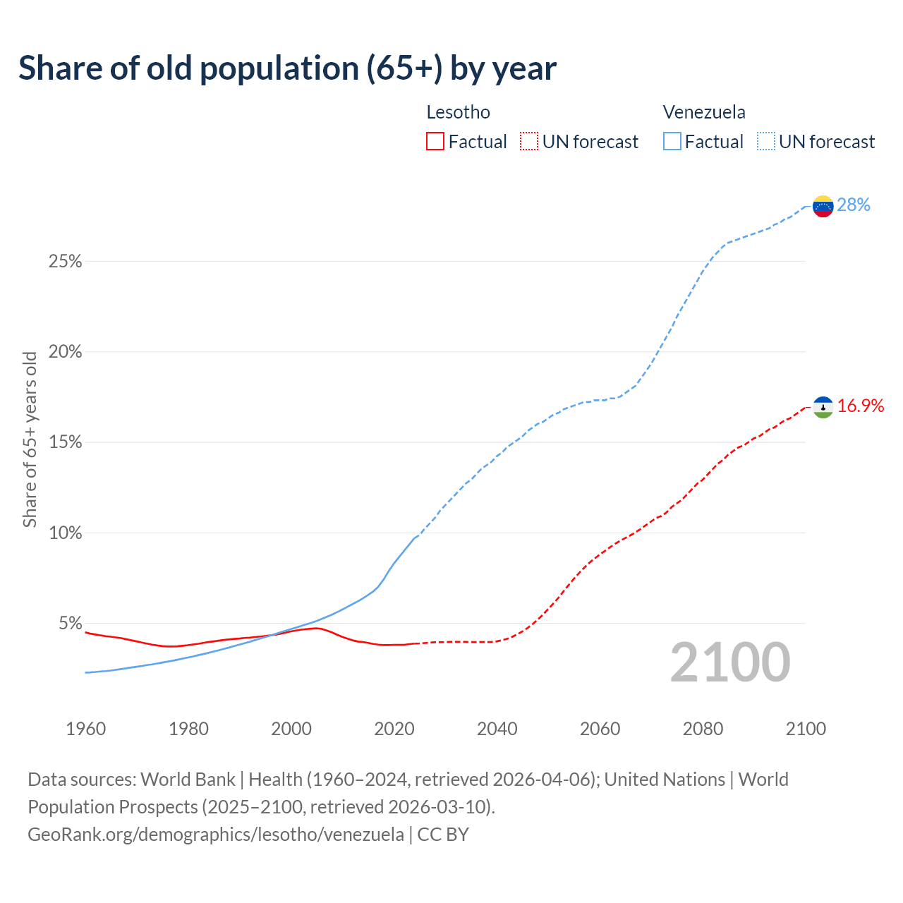 - The share of old-age demographic (65+) in Lesotho is 3.86% vs 9.68% in Venezuela.