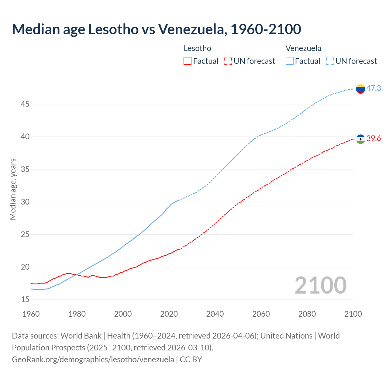 Median age Lesotho vs Venezuela, 1960-2100