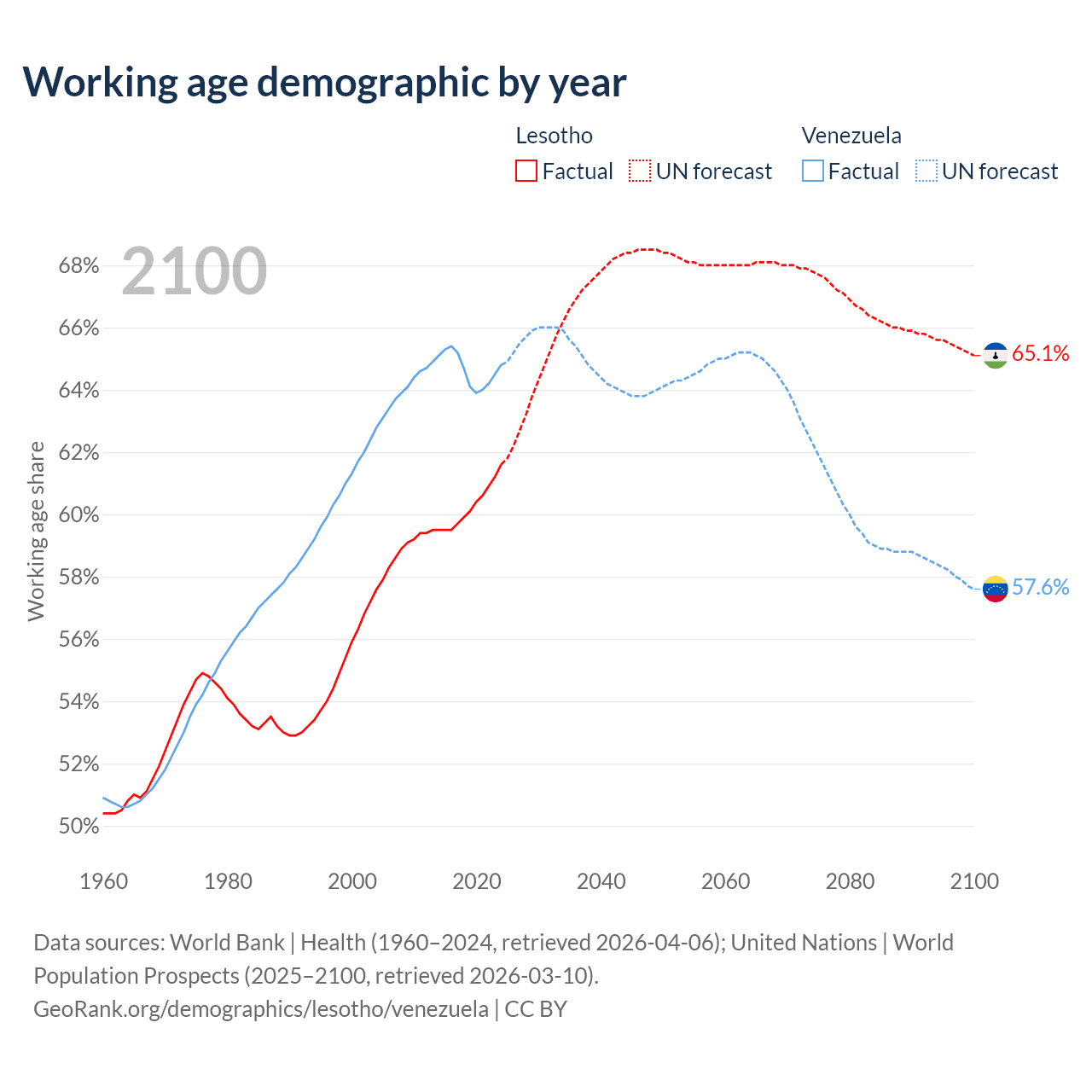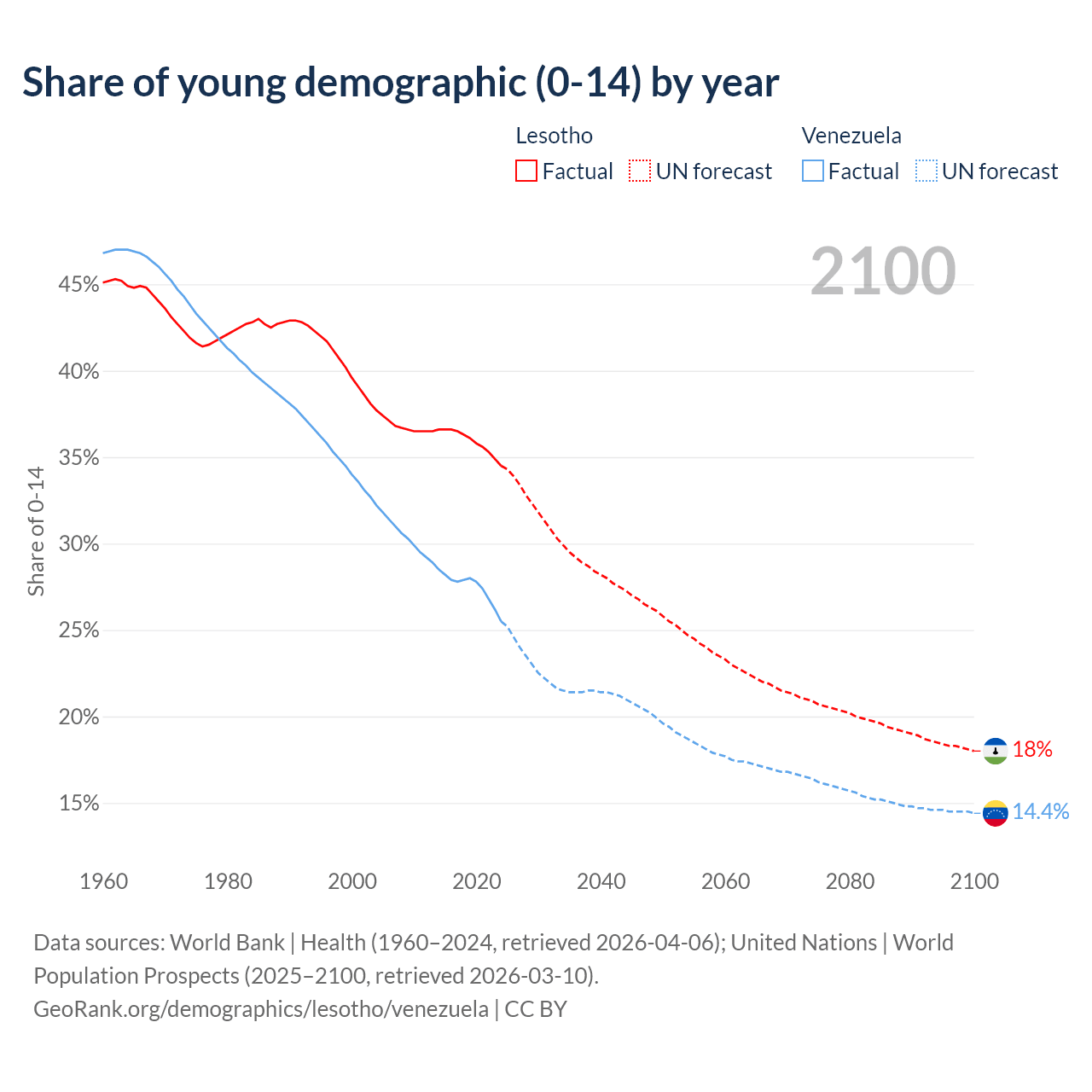 - The share of young demographic (0-15 years old) in Lesotho is 34.5% vs 25.5% in Venezuela.