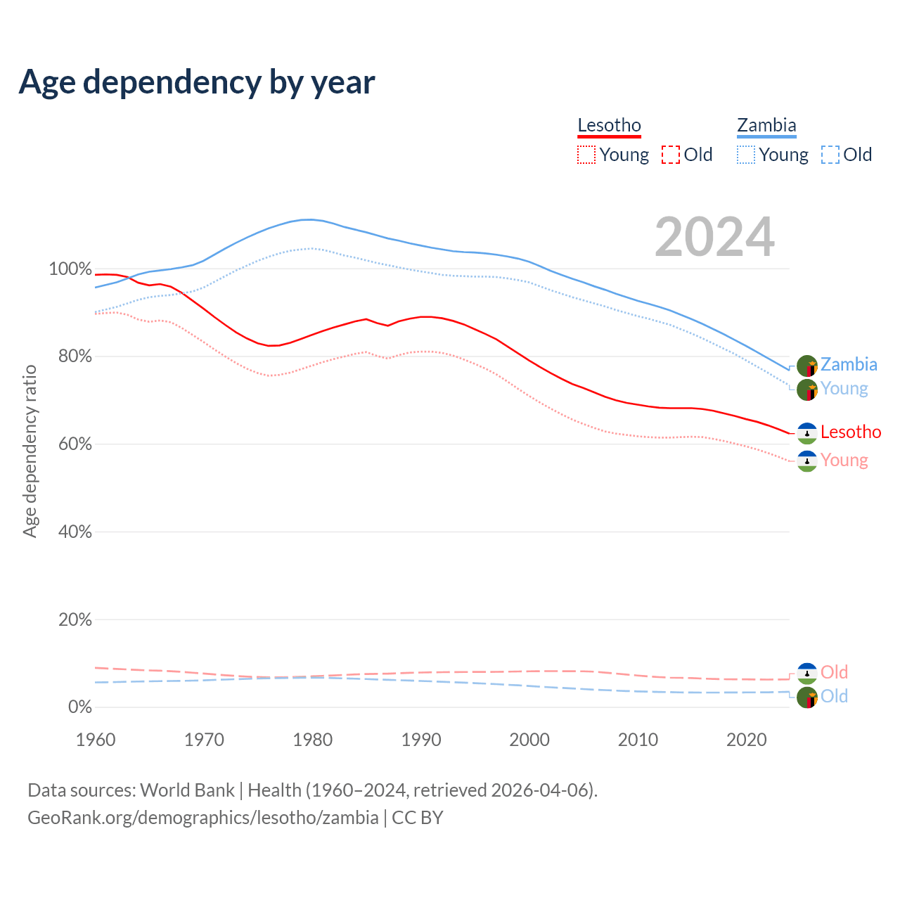 - Lesotho is ranked 143/196 by median age (oldest to youngest) vs 182/196 for Zambia.