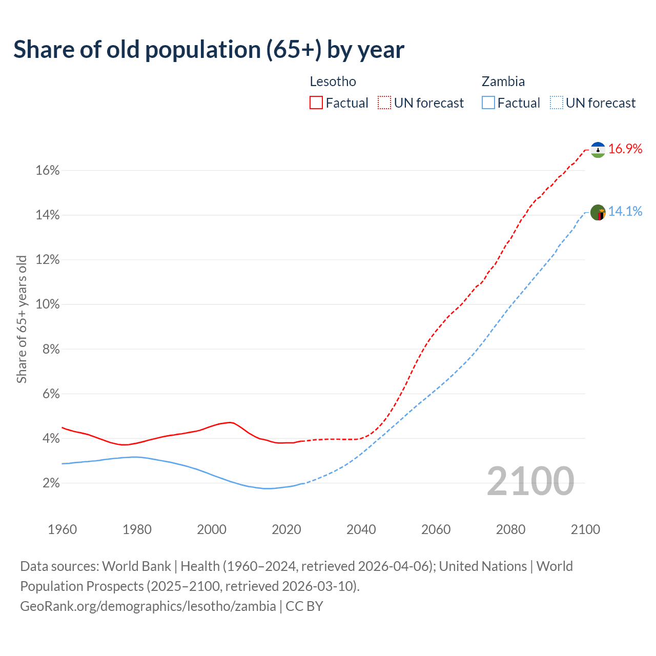 The share of older people aged 65 and over is 3.86% in Lesotho and 1.95% in Zambia. Life expectancy in Lesotho compared to Zambia .