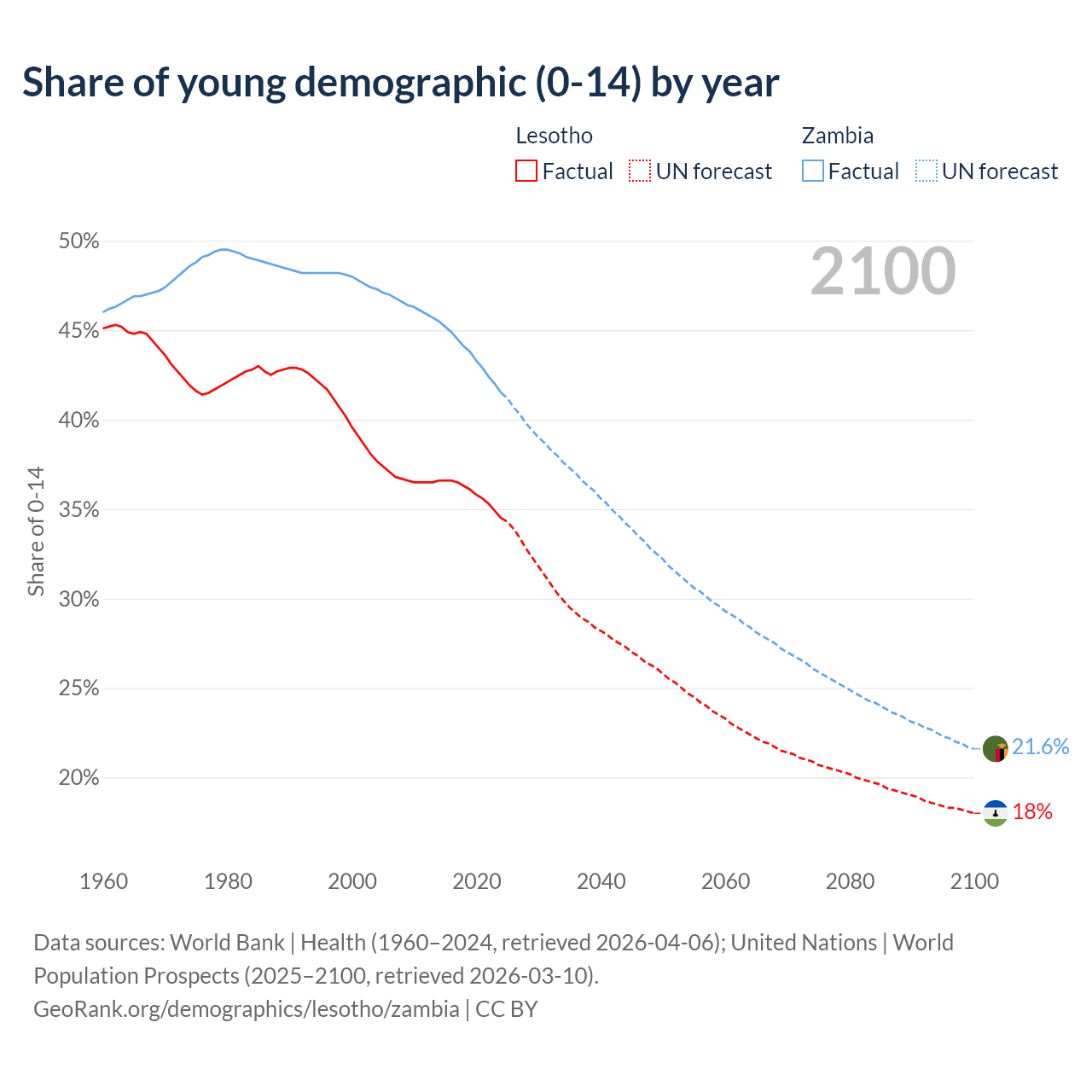 Median age Lesotho vs Zambia, 1960-2100