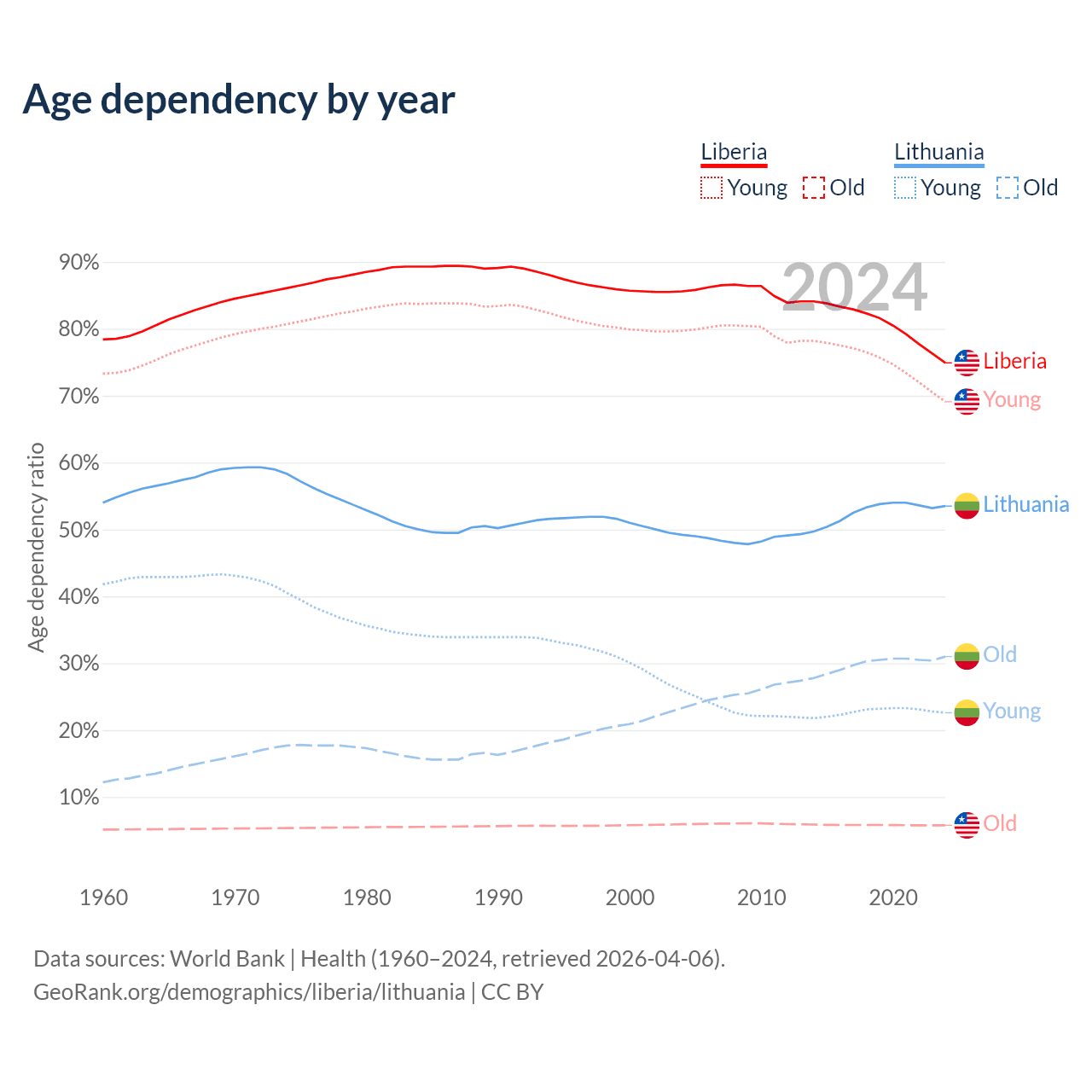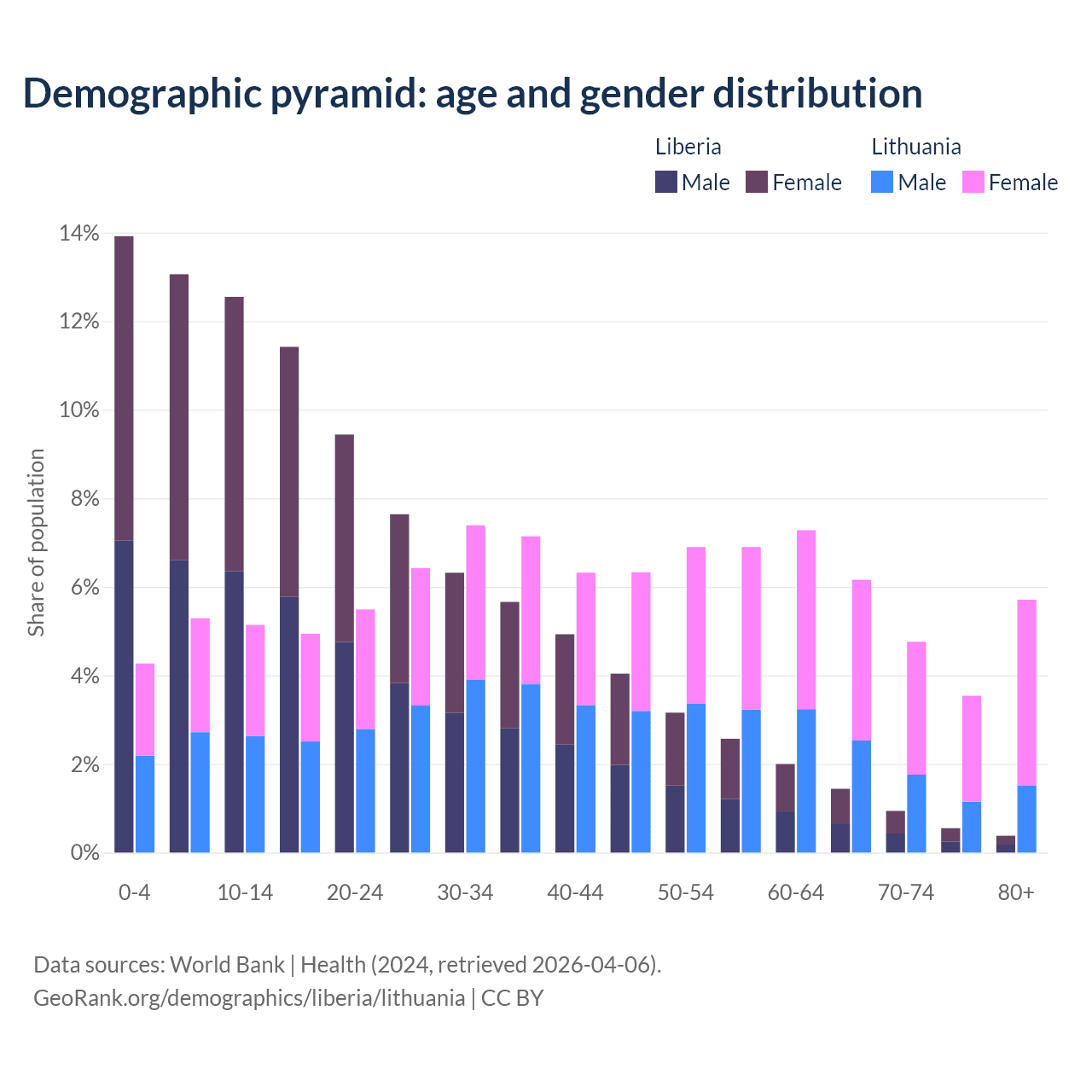 - The share of old-age demographic (65+) in Liberia is 3.3% vs 20.2% in Lithuania.