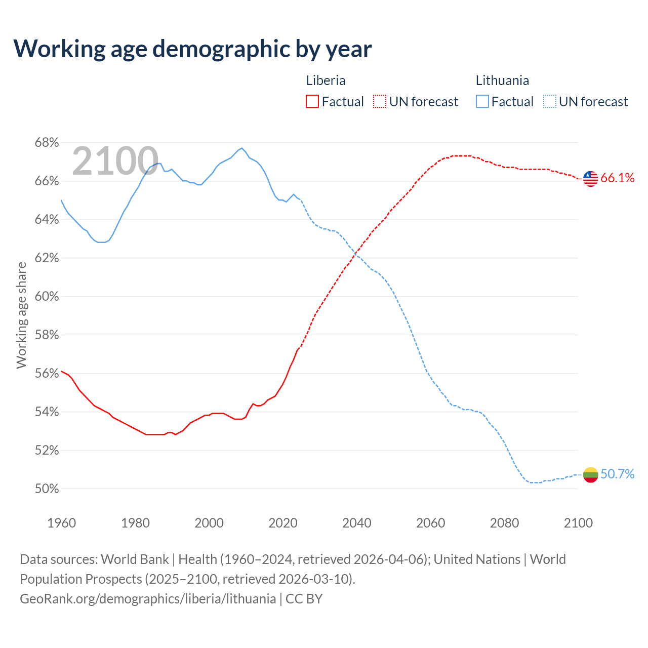 The share of older people aged 65 and over is 3.3% in Liberia and 20.2% in Lithuania. Life expectancy in Liberia compared to Lithuania .