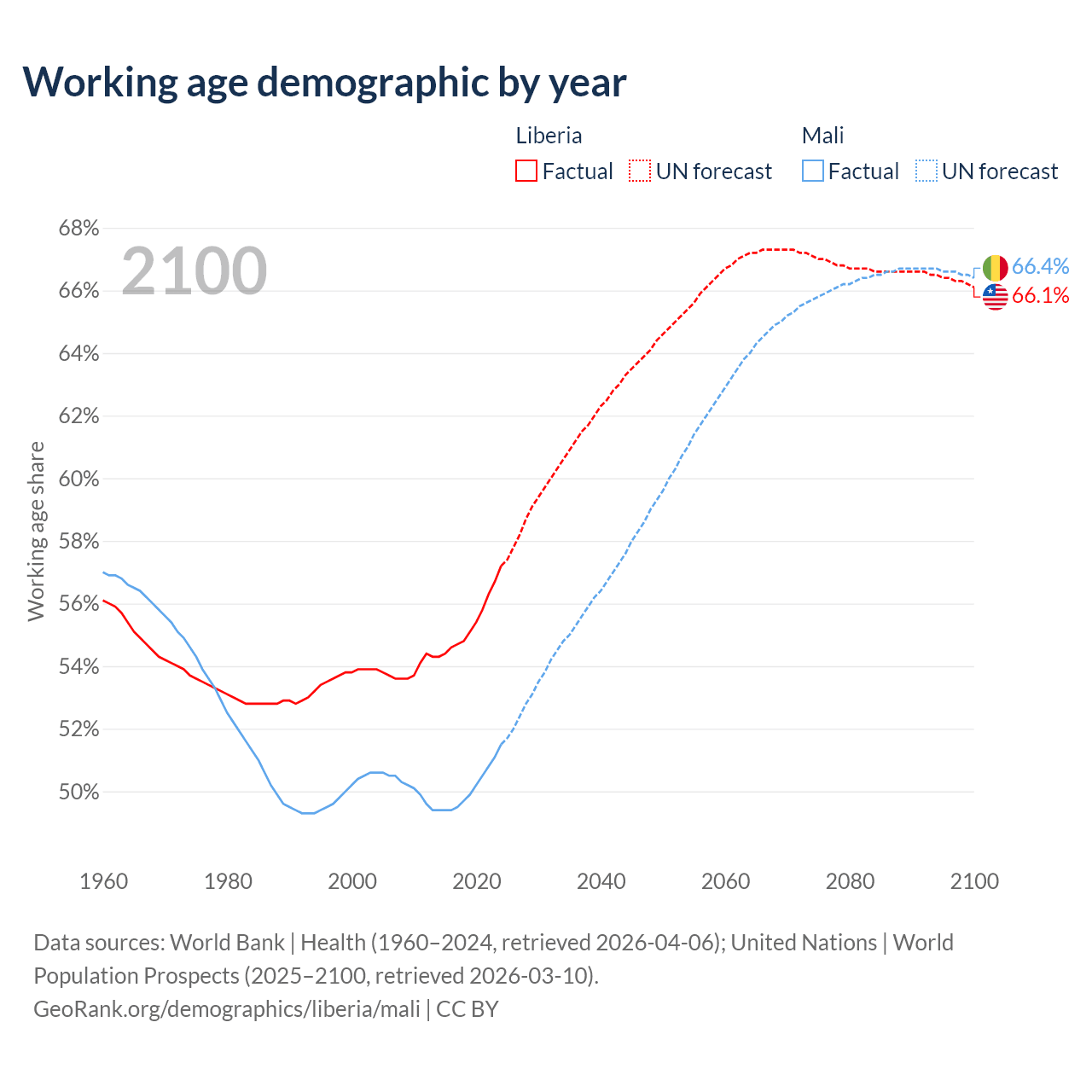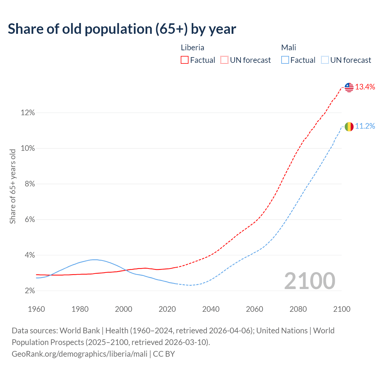 The share of older people aged 65 and over is 3.3% in Liberia and 2.38% in Mali. Life expectancy in Liberia compared to Mali .