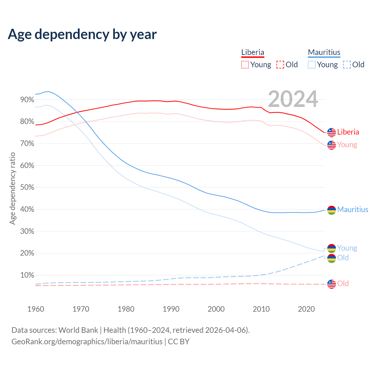 - Liberia is ranked 169/196 by median age (oldest to youngest) vs 57/196 for Mauritius.