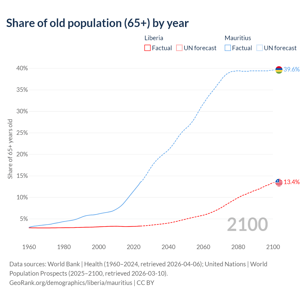 - The share of old-age demographic (65+) in Liberia is 3.3% vs 13.5% in Mauritius.