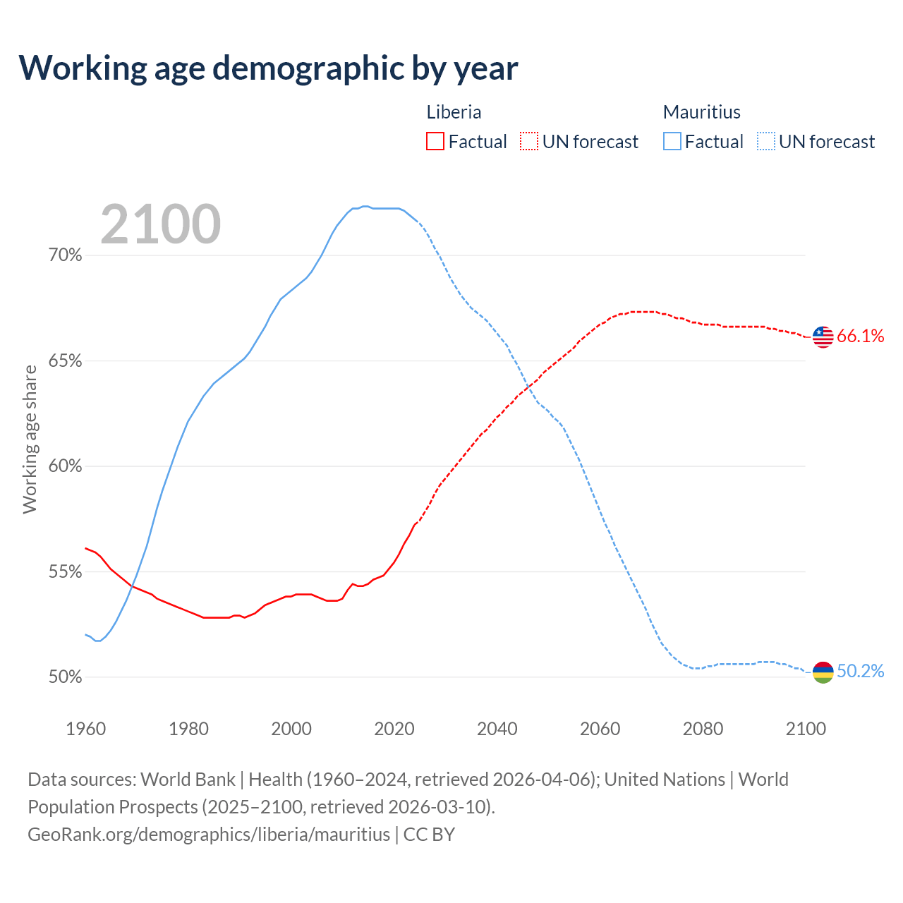 - Liberia has 3.37M working age adults (aged 15-64) vs 889K in Mauritius.