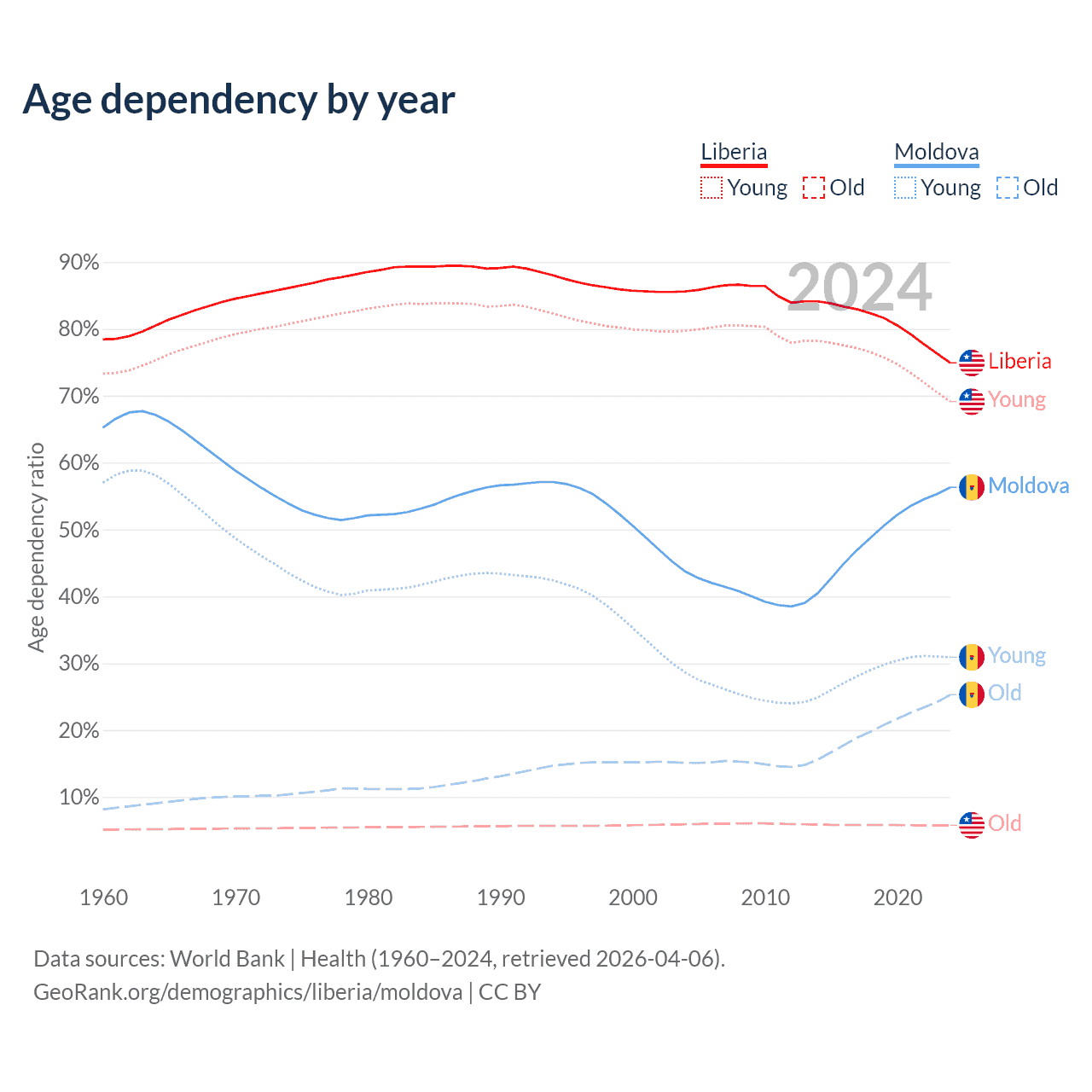 - The share of old-age demographic (65+) in Liberia is 3.3% vs 16.2% in Moldova.