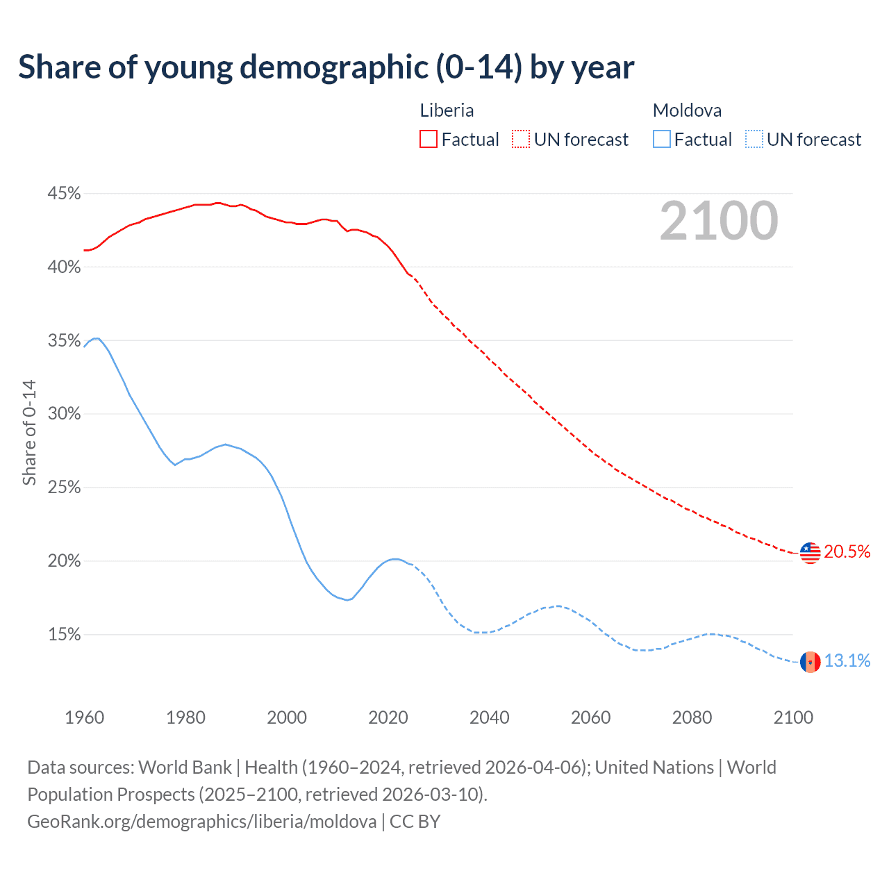 - The share of young demographic (0-15 years old) in Liberia is 39.5% vs 19.8% in Moldova.