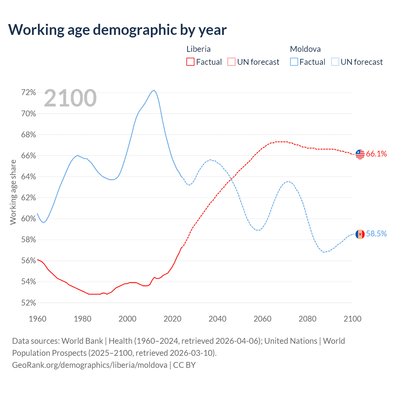 The share of older people aged 65 and over is 3.3% in Liberia and 16.2% in Moldova. Life expectancy in Liberia compared to Moldova .
